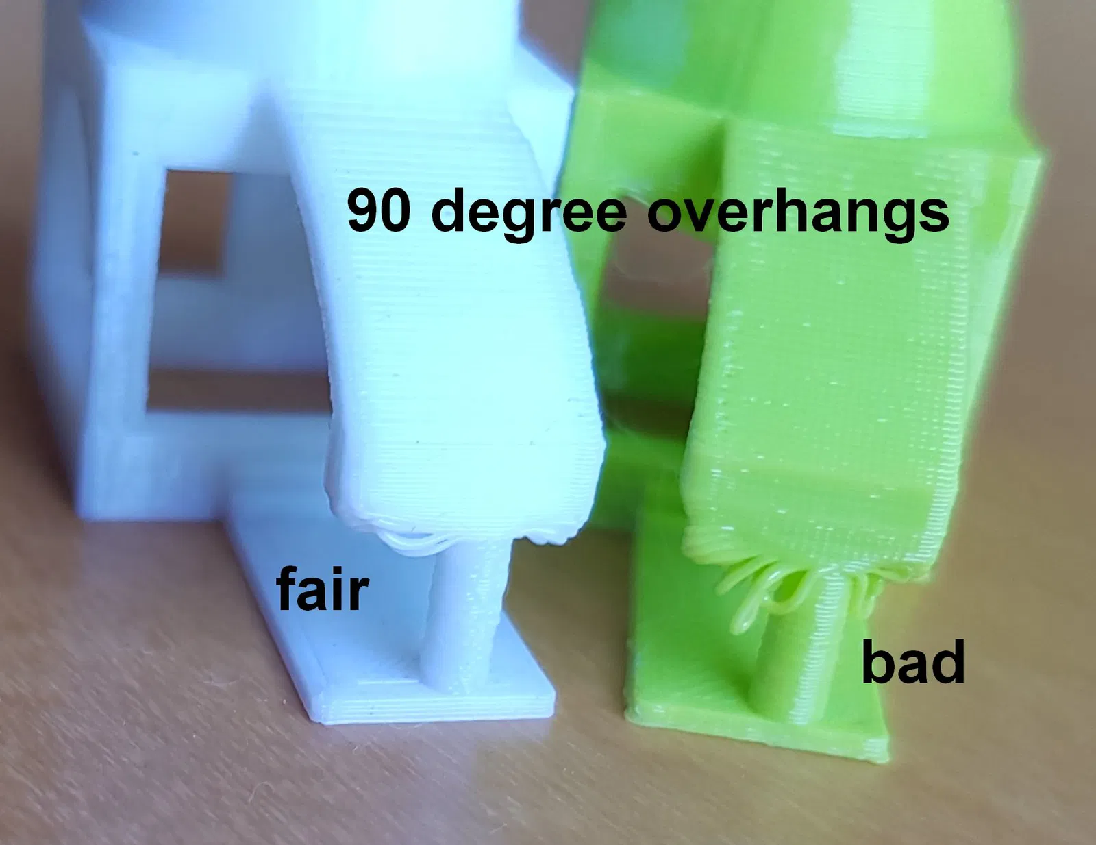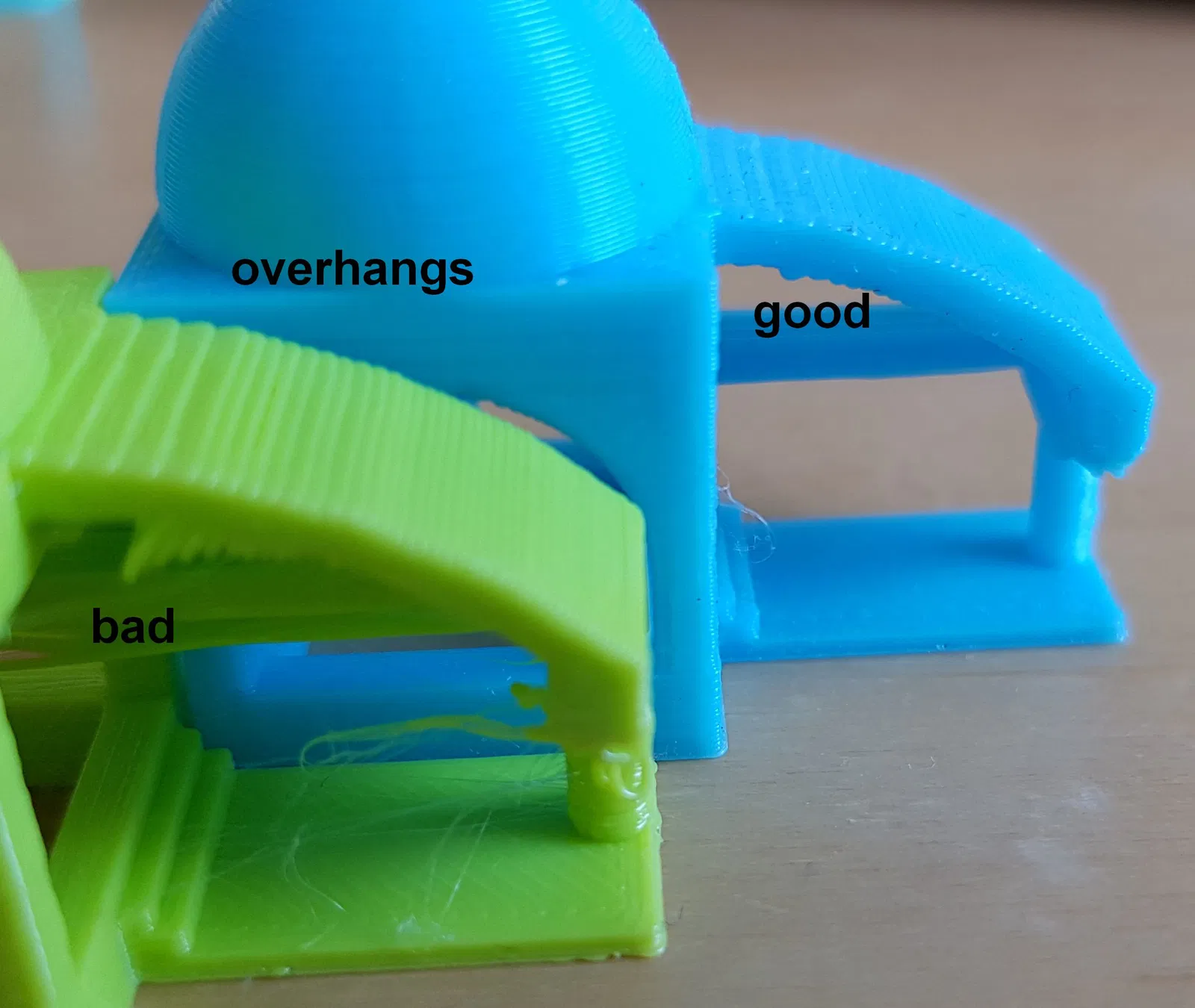 - “overhangs” và “90 degree overhangs”: Máy in của bạn không thể in trong không khí, nhưng nó có thể gắn filament sang hai bên các bộ phận hiện có ở một mức độ nhất định. Các phần nhô ra dốc lên tới 80 độ, nhưng chỉ trong một khoảng cách rất nhỏ và trông sẽ ổn. (Có một phần nhô ra khác giống như vậy bên trong vòm.) Phần nhô ra 90 độ trên đỉnh trụ chưa bao giờ trông hoàn hảo đối với tui, đặc biệt là phần lớn hơn ở bên trái, nhưng nó sẽ cung cấp đủ hỗ trợ sau 1 hoặc 2 lớp.