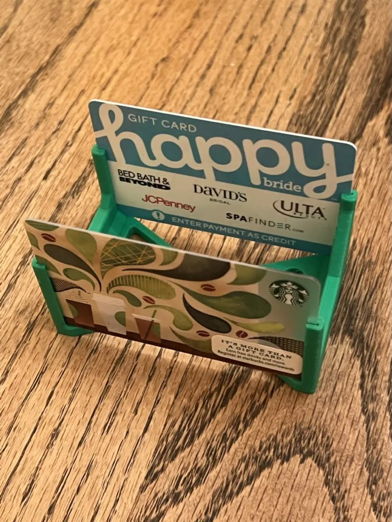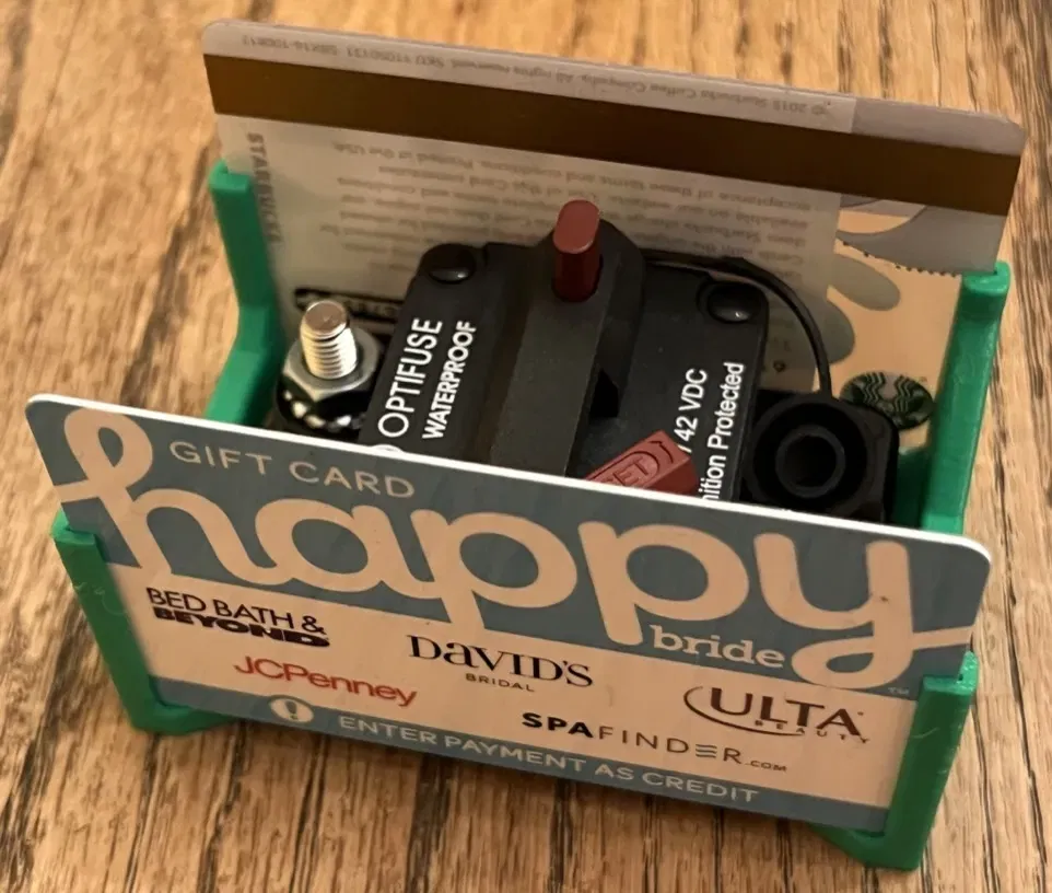 Thiết kế này, theo tui biết, là thiết kế có mức tiêu thụ filament thấp nhất hiện nay. Một phần là do nó sử dụng hai thẻ quà tặng có kích thước tiêu chuẩn (hoặc thẻ tín dụng, thẻ chìa khóa khách sạn, hay bất cứ thứ gì tương tự) để nối hai bên lại với nhau. Chúng khá vừa vặn, nhưng thêm một hoặc hai giọt keo CA sẽ giúp chắc chắn hơn.