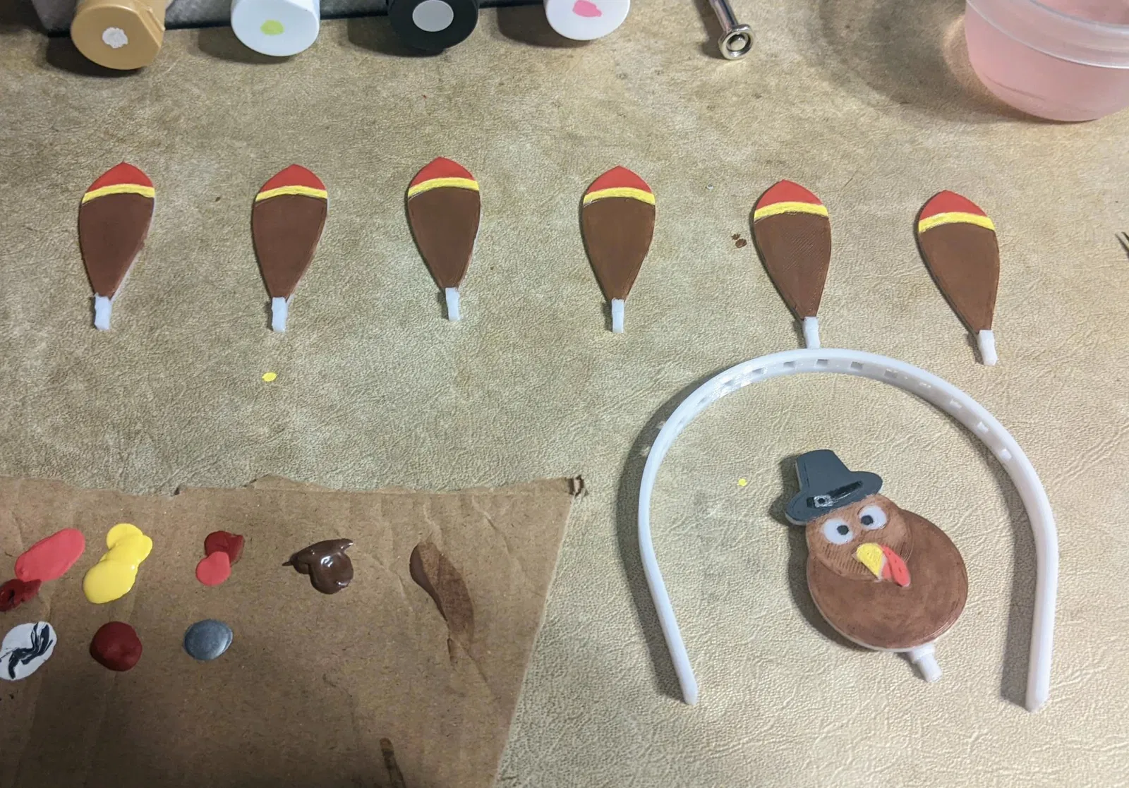 Chỉ là một món đồ trang trí hình gà tây đơn giản cho Lễ Tạ ơn thôi. Các chi tiết được đặt trên các lớp riêng biệt để dễ dàng sơn màu. Phần chân đế cho mặt sẽ gắn vào một lỗ ở phía sau để in thuận tiện hơn. Vợ tui thích kiểu dáng sáu chiếc lông thưa, nhưng trên băng đô có đủ lỗ để gắn mười chiếc lông nếu bạn thích - một hình ảnh cho thấy nó trông như thế nào ở một bên mặt.