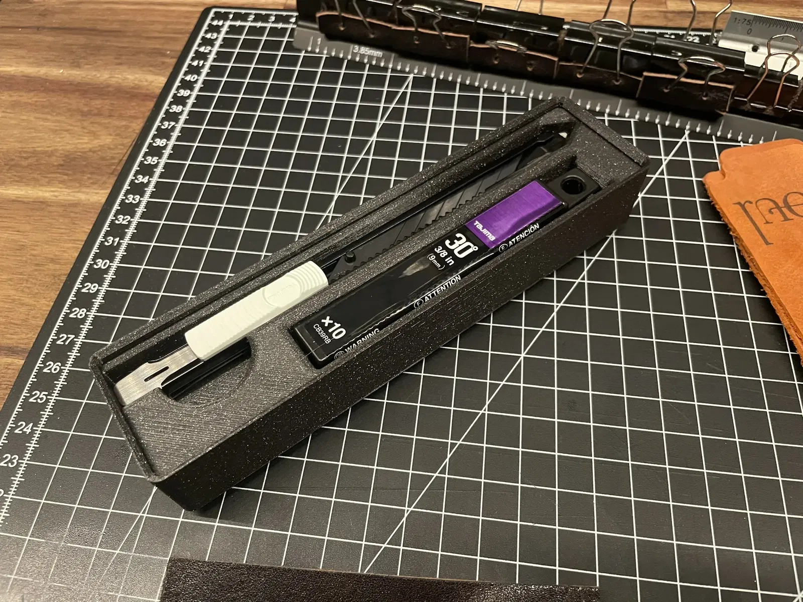 Giá đỡ module Gridfinity 4x1 này chứa dao rọc giấy Tajima DO-E395 và hai bộ lưỡi dao dự phòng. Thiết kế có lỗ gắn nam châm, phù hợp cho các dự án đồ da và người thích tùy biến với Gridfinity.