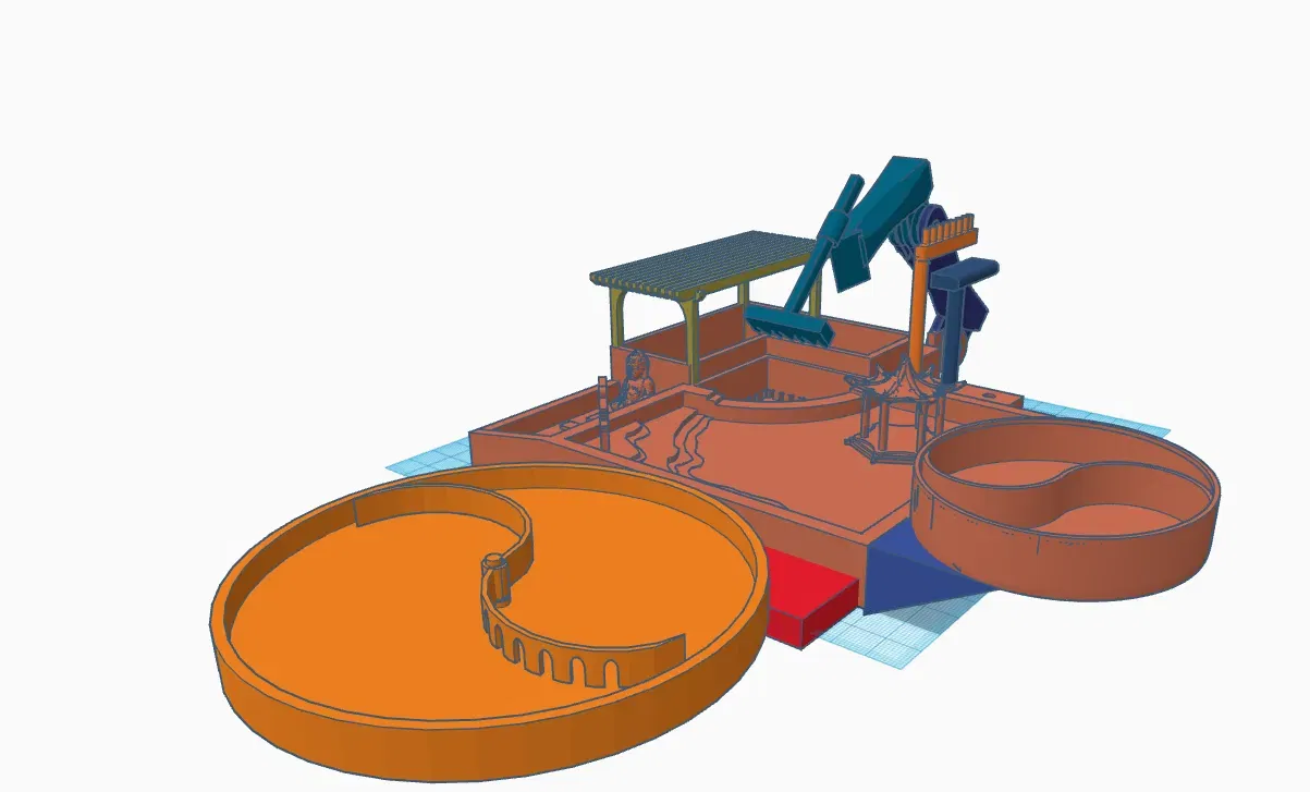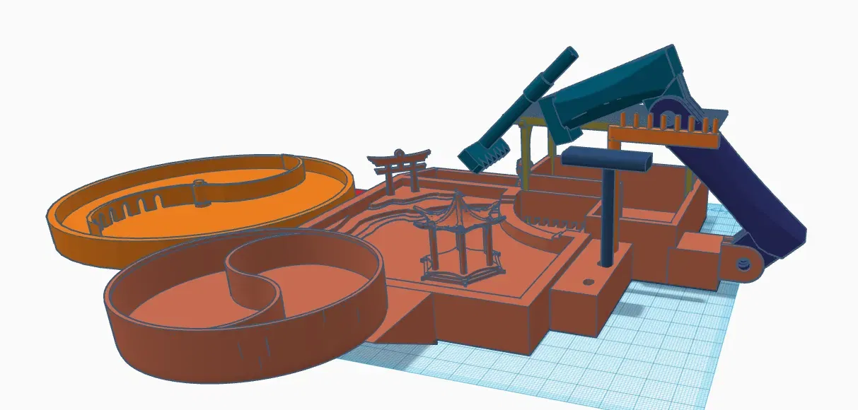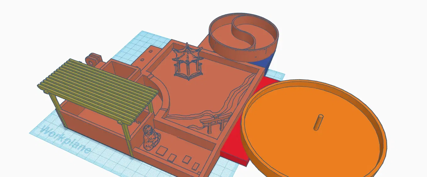 Its a Zen garden with 3 spots the 1st one is quite authentic with its decorations the 2nd one is ayin and yang inspired design the 3rd one has a auto raking feature. it also comes with a modular arm that you can use for raking the sand it also comes with 3 rakes with spots to store them. You will also need m5 bolts and nut to screw in the modular arm