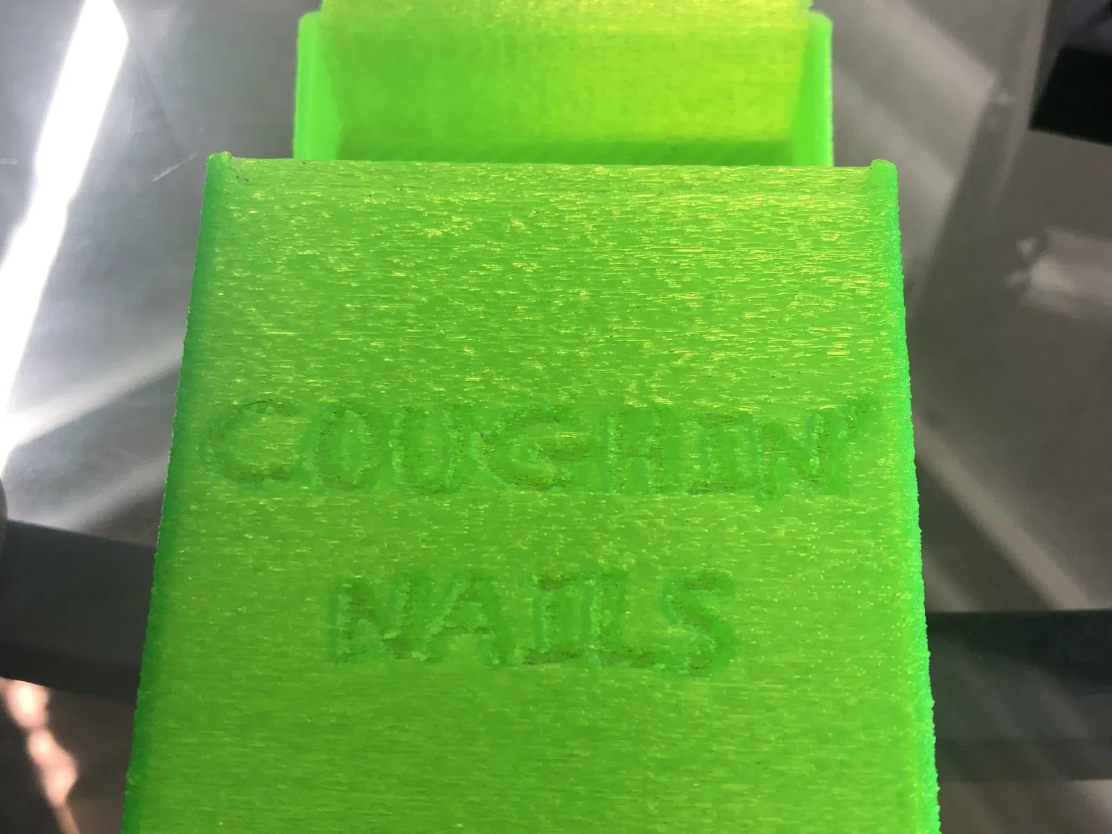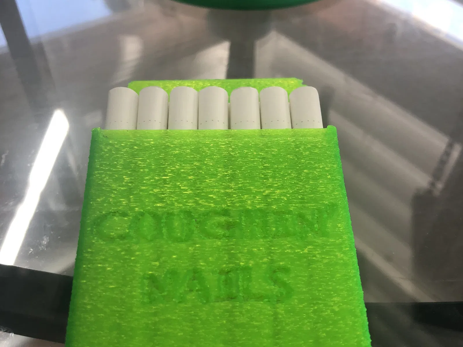 A simple cigarette case. Uses filament as the hinge so no other hardware required. Simply cut a length of filament, melt one end, slide it in and use a hot knife or blade to melt the other end. Print in any material. My personal favorite is TPU with fuzzy skin. Super easy print, no supports or rafts. Holds up to 20 sticks. I've posted a blank one with all the sketchup files so feel free to play around. I've made over 50 of these customized cases over the years with names, logos and messages. Coughin' Nails is my personal play on a disgusting habit. I also have designs that hold 30, 40 and 105 for travel. Contact me if you would like me to post those designs but its a really simple design and a great way to learn the basics of 3D modeling. If you are here maybe consider quitting.