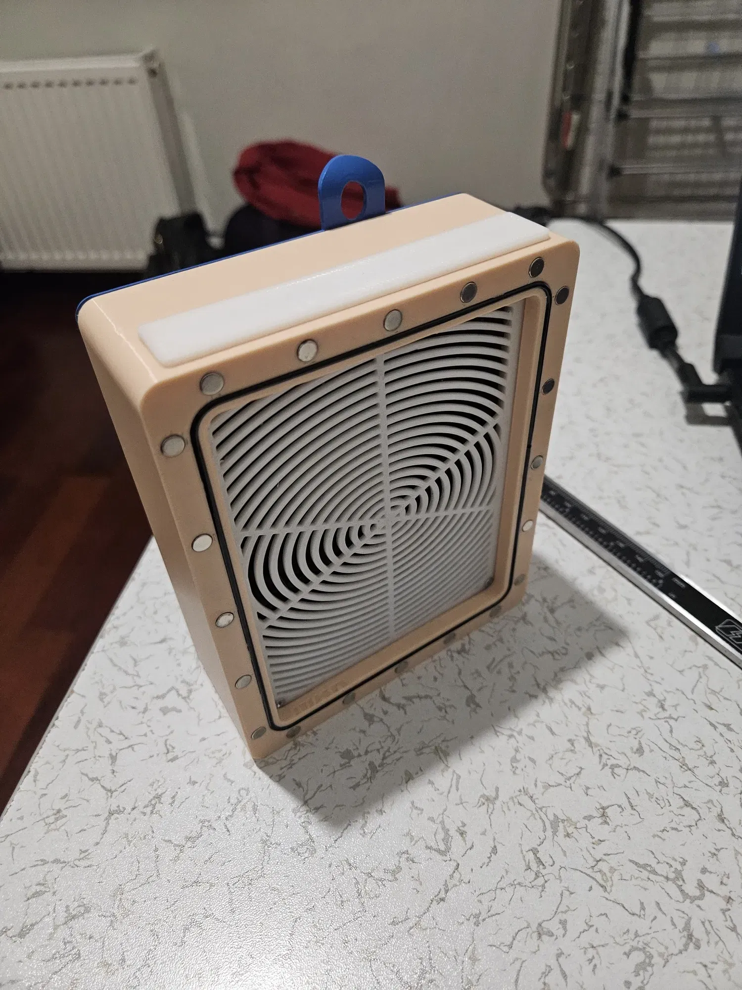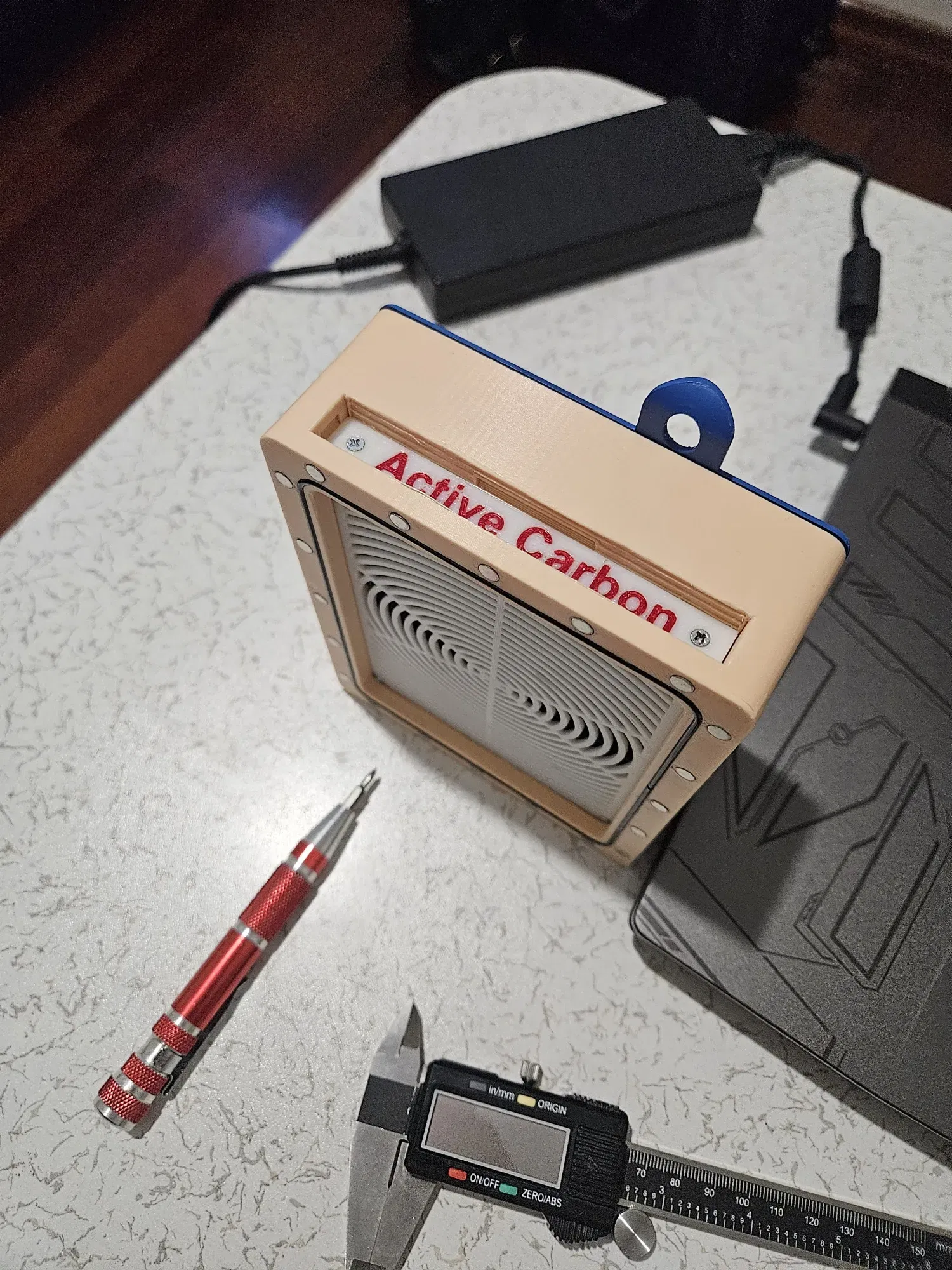 Thiết kế remix từ MAK77, bộ lọc carbon dạng cartridge dễ tháo lắp và đổ đầy. Phần thân làm một khối, nhẹ hơn, cần in có hỗ trợ. Yêu cầu 6 con ốc nhựa, in với layer height 0.2 mm.