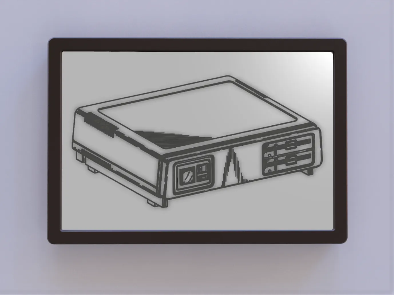 Tranh trang trí 2D cho bản vẽ bằng sáng chế máy tính Tandy 100. Có khung để treo hoặc để bàn, kèm phiên bản mỏng tiết kiệm vật liệu.