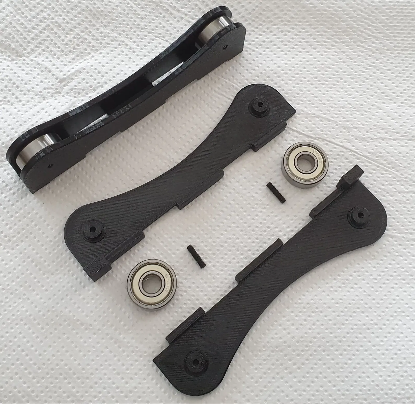 Giá đỡ bánh xe: Các lỗ có đường kính 2,8 mm. Ghép các bộ phận lại với nhau, nén lại và vặn đinh vít M3 x 12 vào
