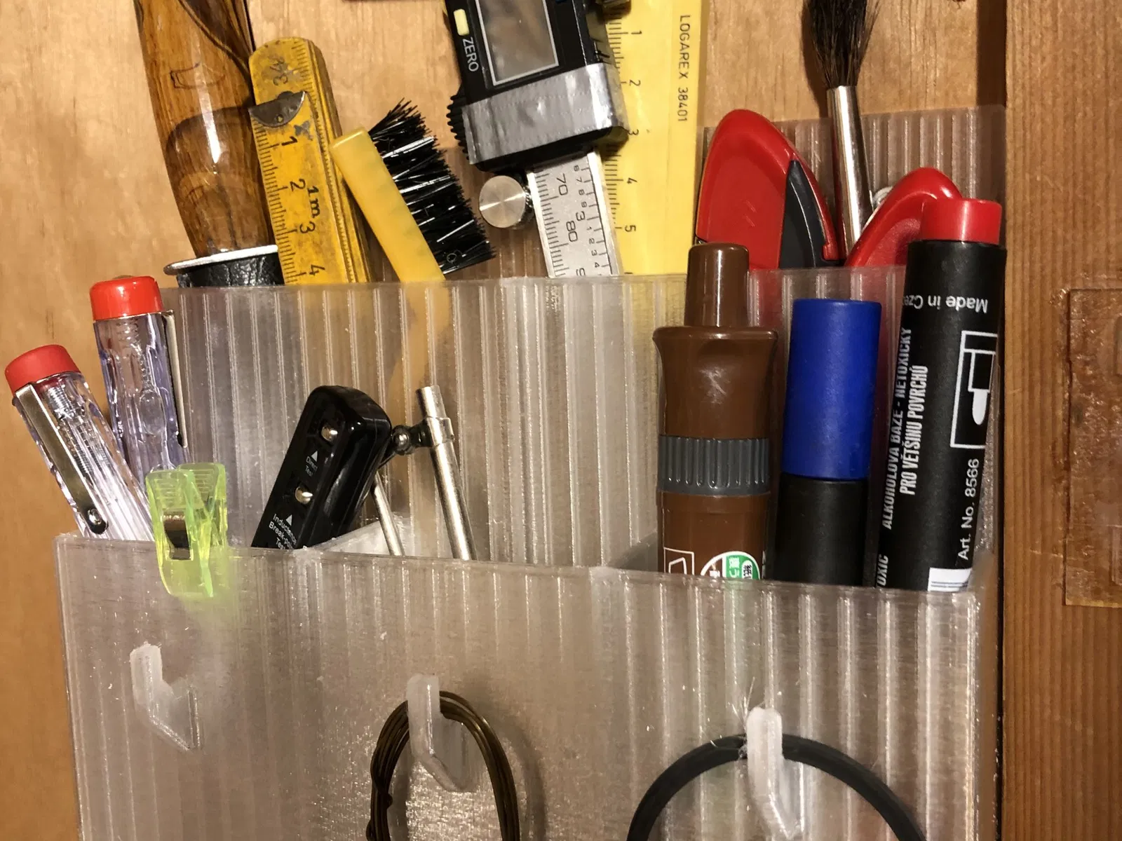 Hộp đựng các dụng cụ nhỏ như thước kẹp, dao rọc giấy, bút... có thể treo trên tường. Bản in này tuy hơi lâu nhưng dễ làm, phù hợp cho vật liệu PLA và có file gốc FreeCAD đi kèm.