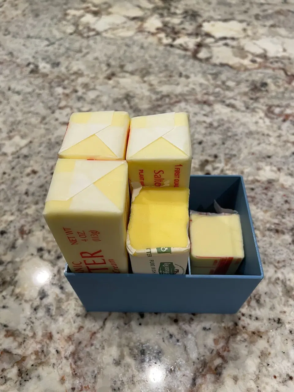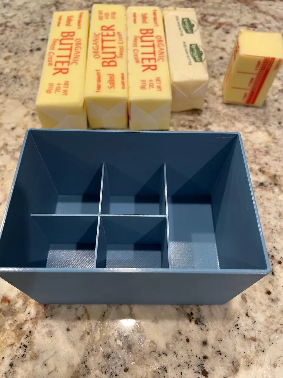 Vợ tui hay để mấy cục bơ trong tủ lạnh, bả muốn có cái khay để giữ cho chúng gọn gàng mà chiếm ít diện tích thôi. Phiên bản đầu tui làm không có vách ngăn, nên nếu để có mấy cục bơ thôi thì nó dễ bị ngã. Phiên bản này có thêm vách ngăn nha. Có bốn ngăn cho mấy cục bơ đầy hoặc gần đầy. Ngăn thứ năm là ngăn đôi vì tui để ý là khi cục bơ còn ít á thì khó lấy lắm. Cái ngăn rộng hơn này giúp mình dễ dàng cầm bằng hai ngón tay.