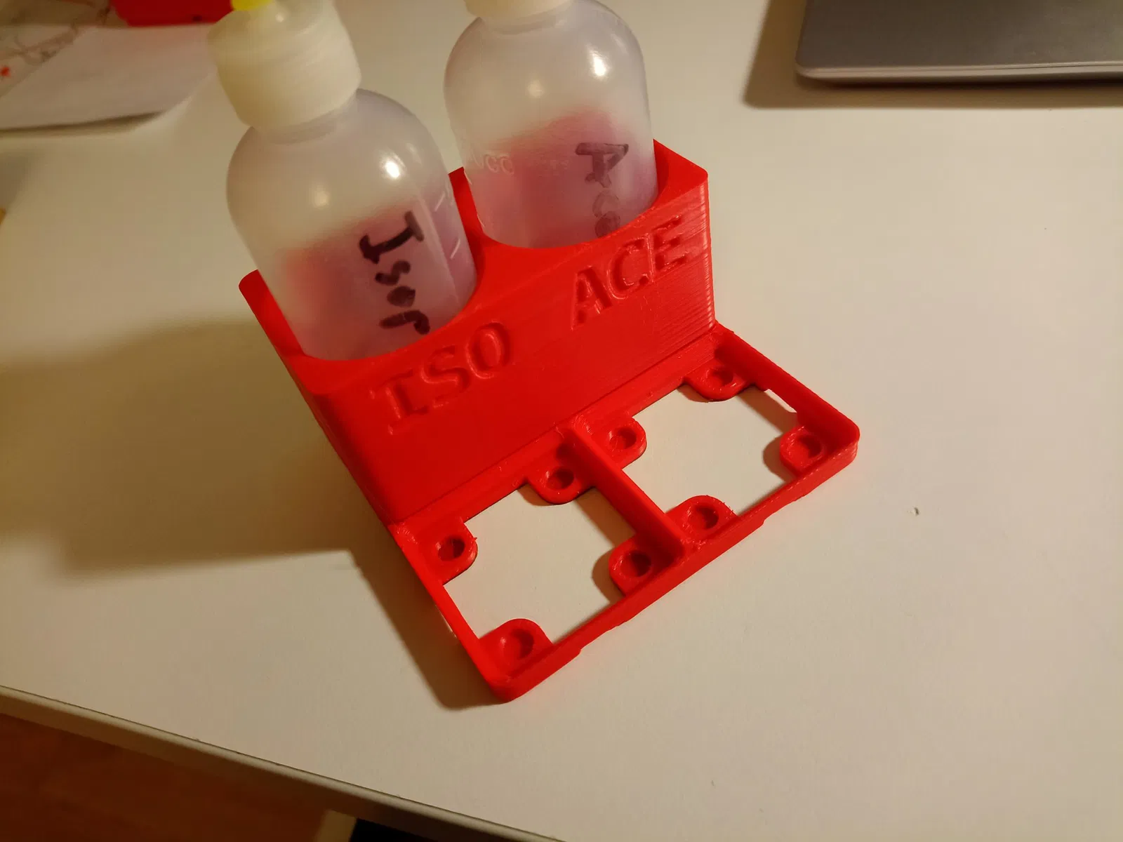 Chắc là hai cái hóa chất hữu ích nhất trong xưởng, cồn isoprop và acetone lúc nào cũng phải có sẵn. Với cái khay nhỏ này cho chai 50mL, bạn lúc nào cũng có sẵn chúng, dán nhãn đàng hoàng và tránh bị đổ.