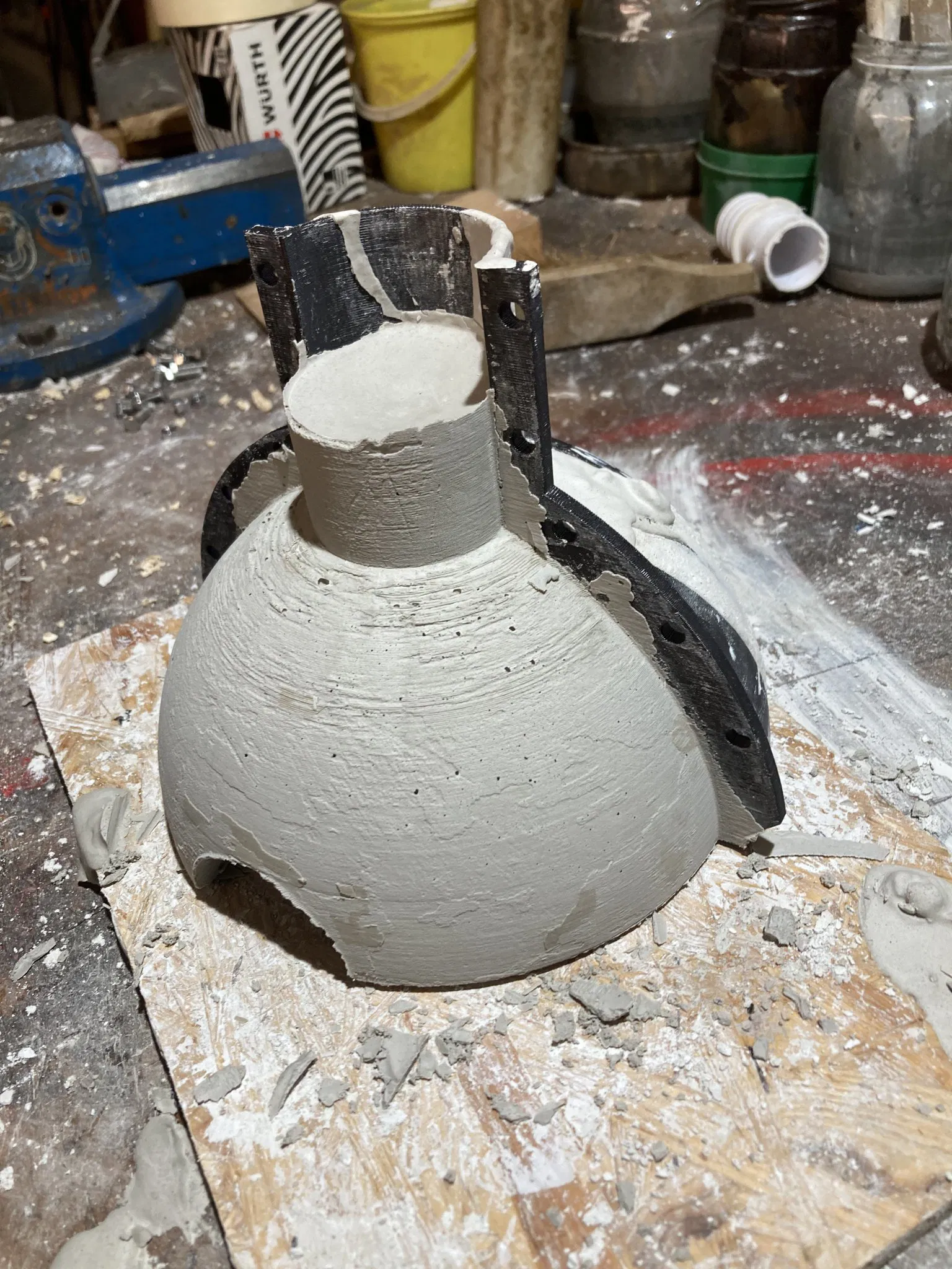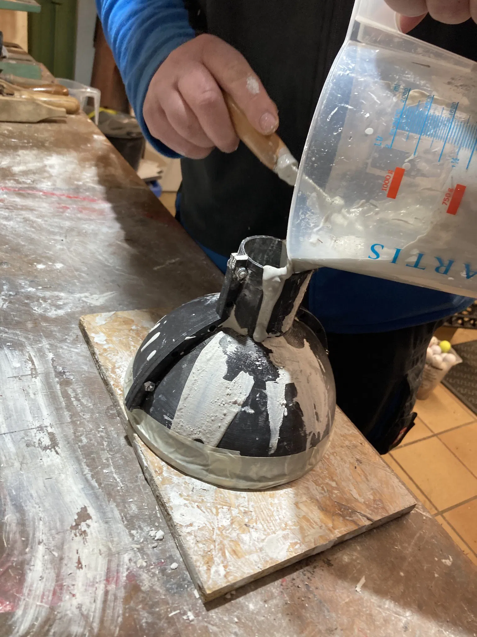 Place the outer walls on the sphere an close eyerything with bolts. If you like you also can thighten up the edge with some duct tape to prevent leaking of the plaster. I used very fast hardening plaster and you should too.