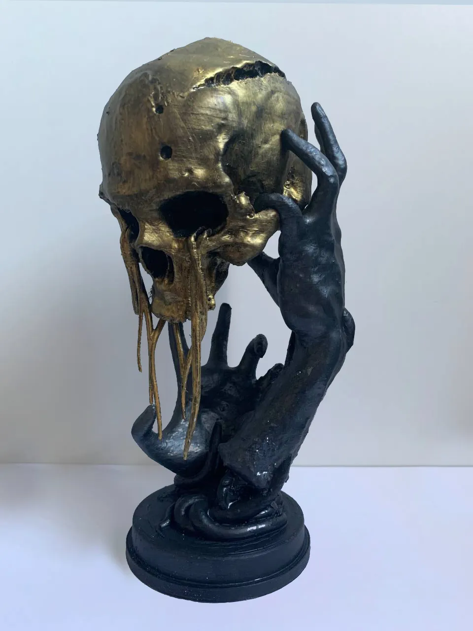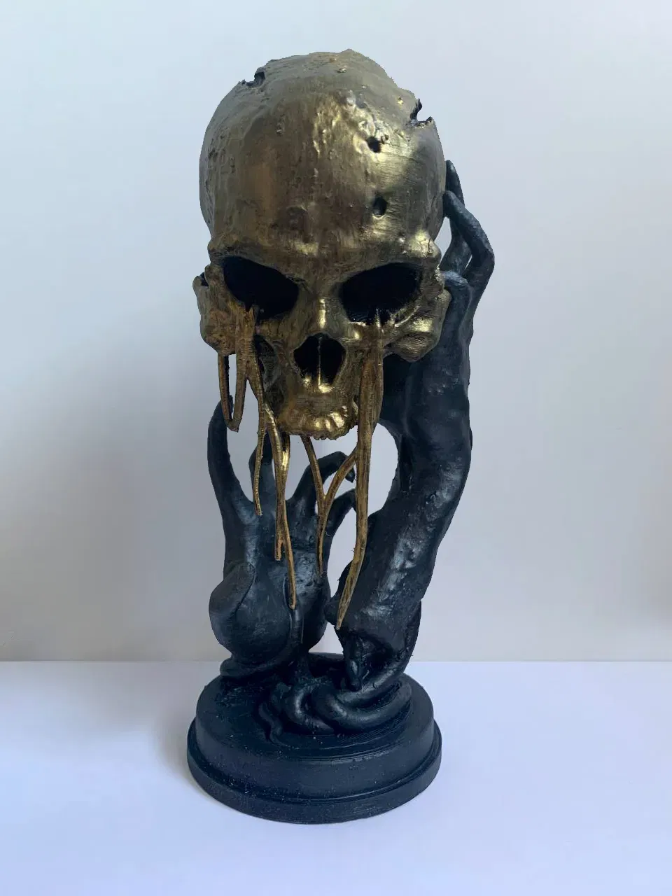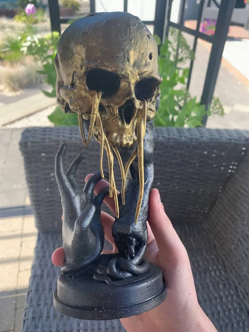 In bằng PLA, kích thước 1:1 với vật phẩm thật trong game. Cái que cầm này có đi kèm để cho đúng chuẩn, tui thì tui thích để không có cái que đó mà nó vẫn dính ngon lành, chỉ cần thêm tí keo giữa mấy đầu ngón tay với cái đầu lâu.