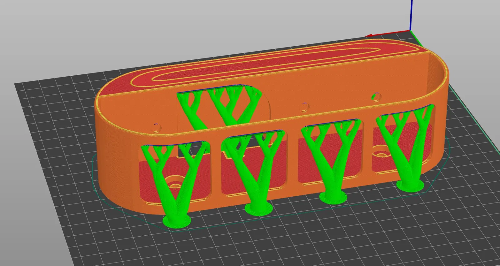 Tôi đã in thành công với lớp cắt 0.25, theo hướng đặt của mẫu. Tôi đã sử dụng các thanh chống dạng cây ở một vài vị trí (xem hình).