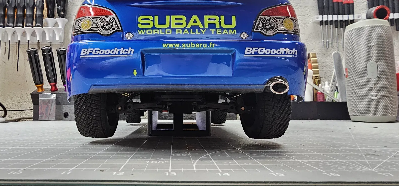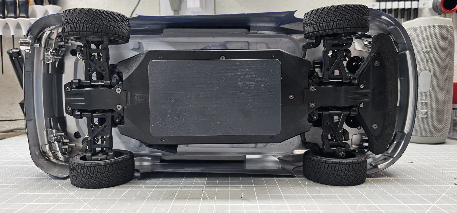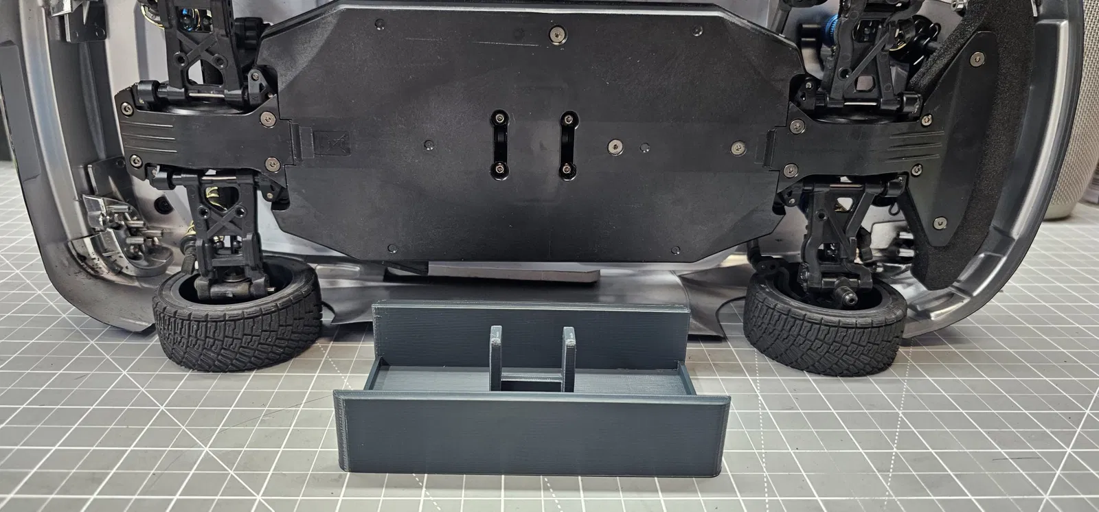 Chân đế xe Rally Tamiya XV02. Chân đế này có thiết kế thấp và sẽ gắn vào khung gầm. Giúp bạn dễ dàng trưng bày trên kệ.