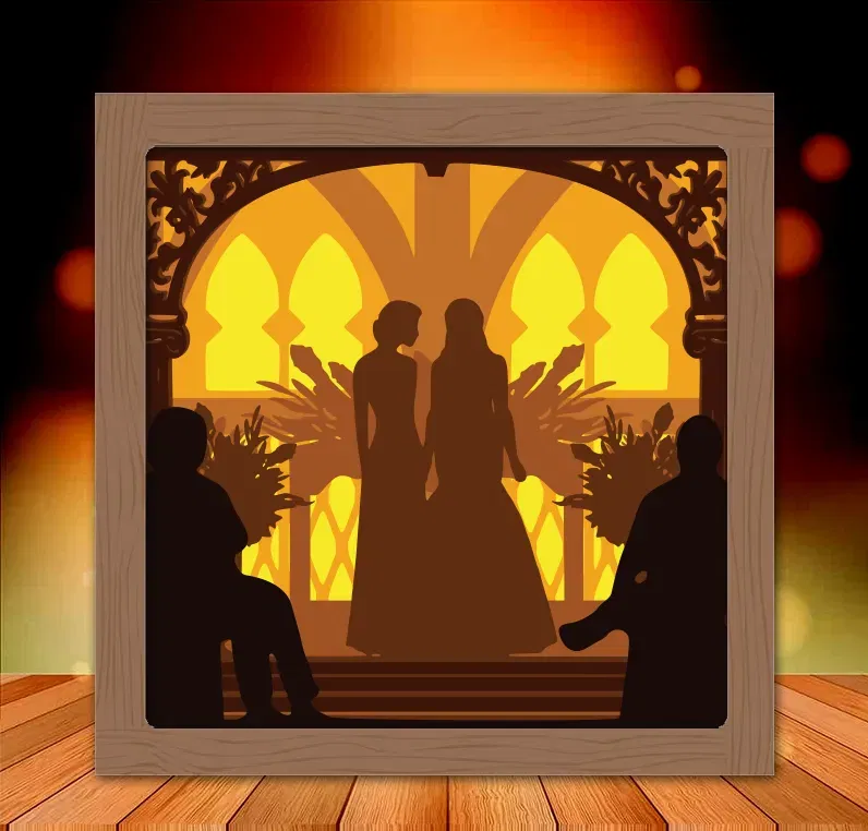 Mô hình hộp đèn trang trí "Mrs and Mrs Wedding light box 3" này là một món quà độc đáo cho các cặp đôi. Link mua đèn và file SVG đã được cung cấp bên dưới. Liên hệ qua email nếu cần hỗ trợ.