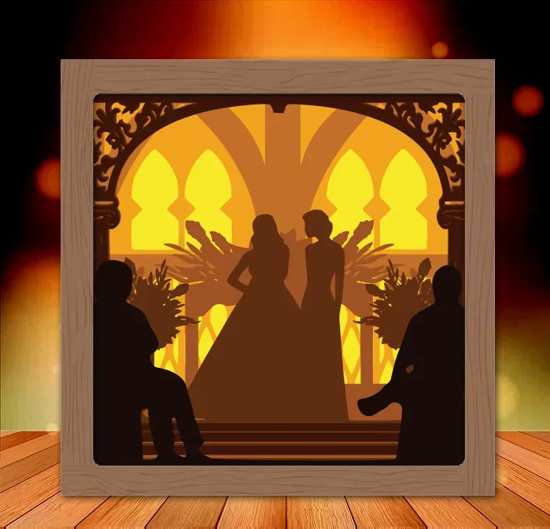 Mô hình hộp đèn "Mrs and Mrs" độc đáo, hoàn hảo cho đám cưới. Mua đèn trang trí hoặc file SVG hỗ trợ lắp ráp trên Patreon. Liên hệ email để được giải đáp thắc mắc.