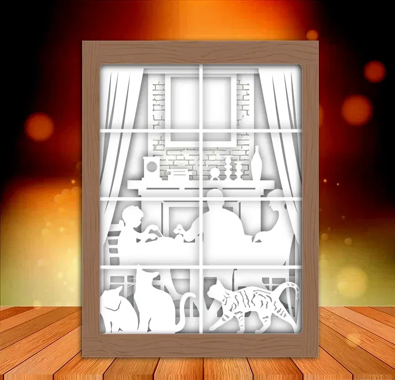 Tạo một hộp đèn gia đình hạnh phúc với mẫu in 3D này. Mua đèn chiếu sáng từ AliExpress hoặc Amazon, lấy file SVG trên Patreon và xem video hướng dẫn lắp ráp. Liên hệ qua email để được hỗ trợ thêm.