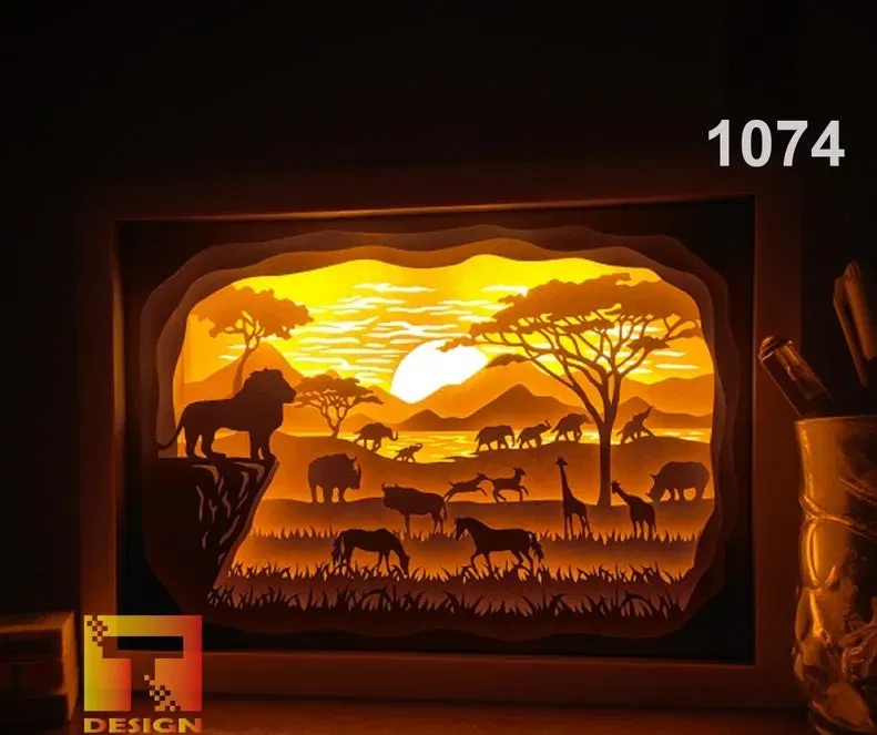 Mua đèn trang trí Hộp đèn Savan Châu Phi trên AliExpress, Amazon hoặc tải file SVG từ Patreon. Xem video hướng dẫn lắp ráp và liên hệ qua email nếu cần.