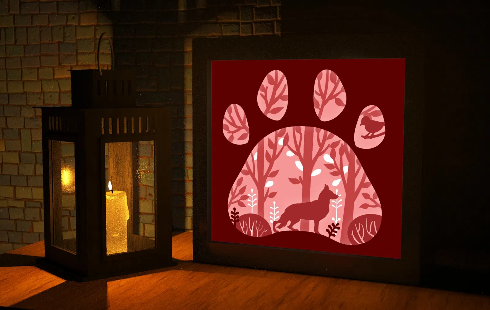 Chiếc hộp đèn trang trí với chủ đề sói và rừng này là một món đồ độc đáo. Bạn có thể mua đèn tại đây: https://s.click.aliexpress.com/e/_DE4xxNH hoặc từ Amazon: https://amzn.to/3Pb4ToJ. File SVG có trên Patreon của tác giả, và video hướng dẫn lắp ráp cũng được cung cấp để bạn dễ dàng thực hiện.