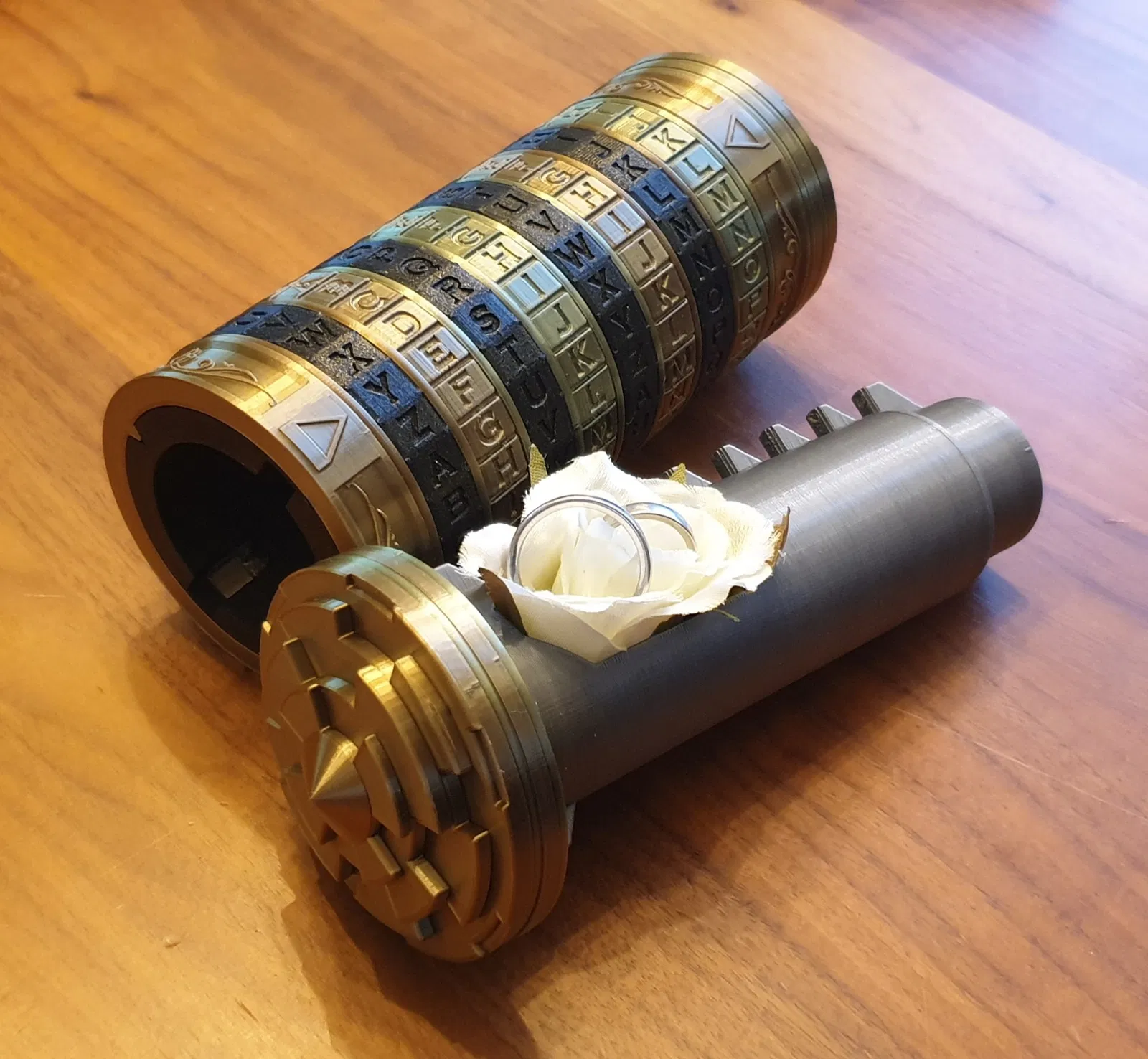 Cryptex hoạt động hoàn hảo này có mã dễ dàng thay đổi và được mô phỏng theo Cryptex được mô tả trong tiểu thuyết 'Mật mã Da Vinci' của Dan Brown.