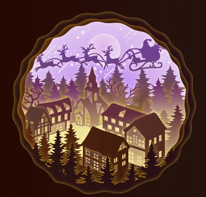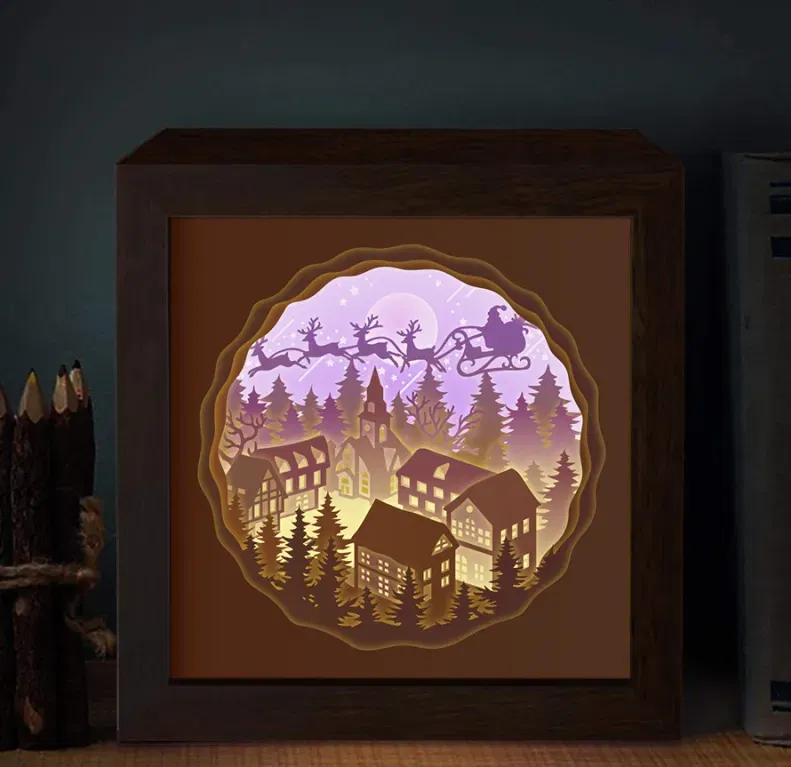 Hộp đèn ông già Noel đi phát quà là một mô hình 3D độc đáo, thích hợp cho dịp Giáng sinh. Bạn có thể mua đèn trang trí tại đây: [https://s.click.aliexpress.com/e/ erase_DE4xxNH](https://s.click.aliexpress.com/e/_DE4xxNH). Các file SVG và video hướng dẫn lắp ráp cũng có sẵn trên Patreon của tác giả.