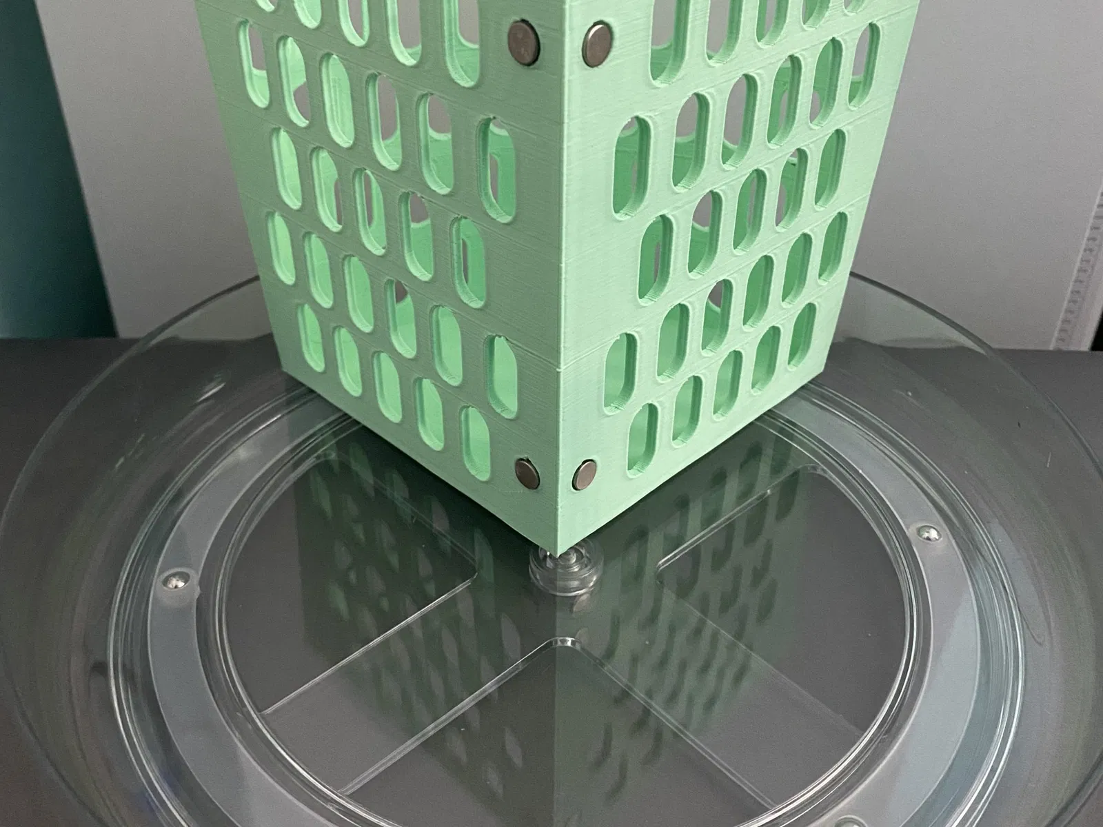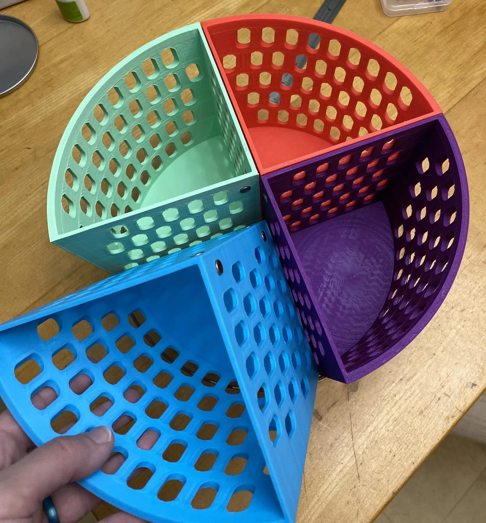 Tôi tìm hoài mà không có hũ hay khay đựng muỗng nĩa nào ưng ý mà để vừa hết mấy món đồ dùng bếp của tôi, nên tôi tự làm cái này. Chia làm 4 phần để có thể in nhiều màu khác nhau. Có lỗ để gắn nam châm gần "tâm" hình tròn để giúp chúng đứng thẳng.