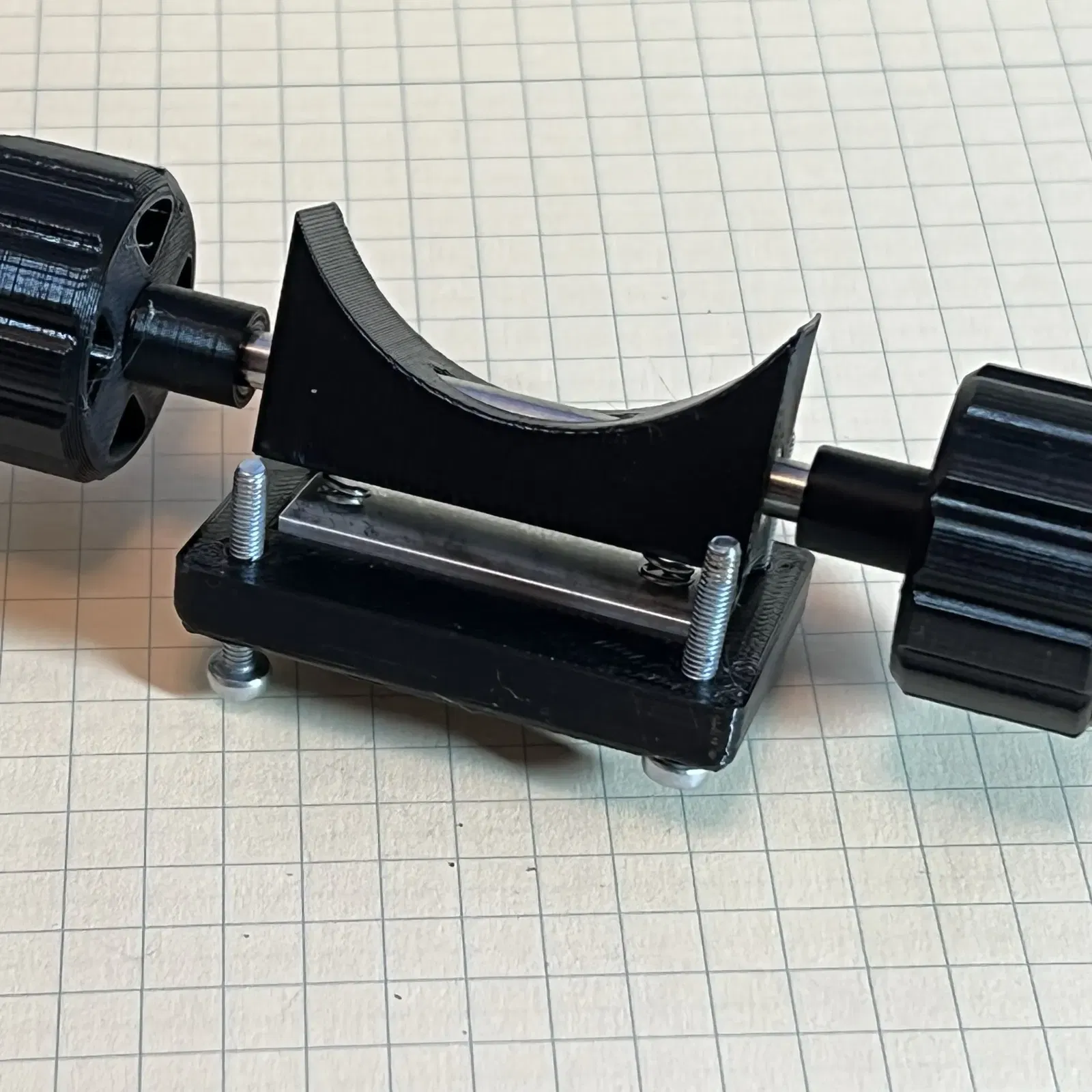 Sau đó thì ráp cái ống trục chính. Có hai file STL, một cái cho ống và một cái cho nắp. Định hướng cả hai cái với cái mặt bích hướng xuống bề mặt in trong slicer. Chèn brass insert vô cái này nữa và một cái insert M4 gần phần phẳng của cái mặt bích trên để giữ ốc vặn cho cố định cái eyepiece. Lấy ba cái tấm bề mặt bạc đạn và chèn chúng vô các rãnh ở phần lớn. Chèn ống trục chính vô thân chính để mấy cái bạc đạn chạy trên hai tấm và bánh răng chạy trên một tấm, rồi thêm cái nắp sao cho mấy cái tấm chui vô các rãnh trong nắp. Phần phẳng có ốc vặn eyepiece hướng ra xa bánh răng. Rồi lắp nắp ống trục chính, cố định bằng 3 con ốc, và ống trục chính được khóa lại. Tìm cho được một cái nylon M4 thumbscrew nếu có thể để cố định eyepieces.