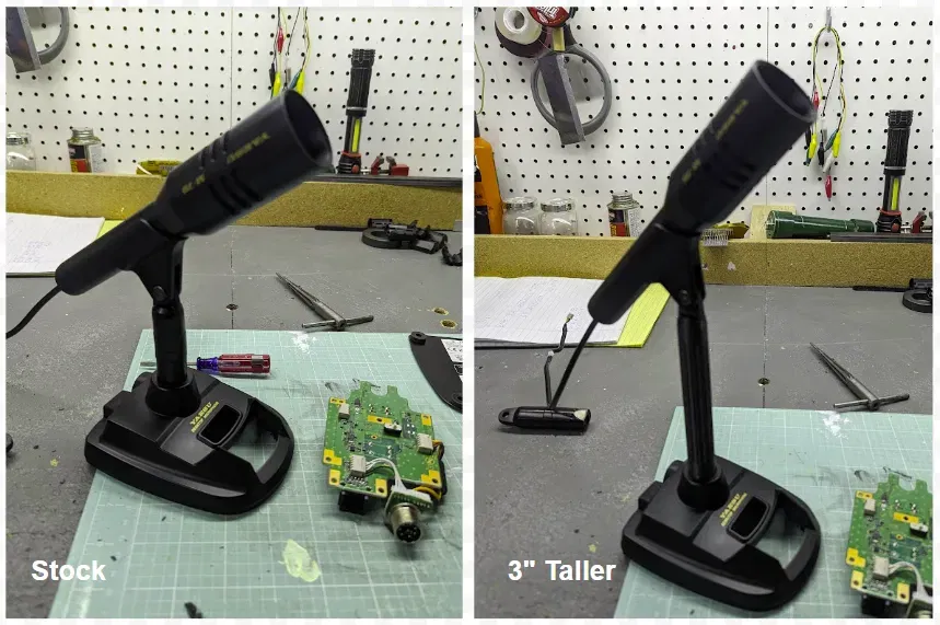 Micro dể bàn Yeasu M-70D là một sản phẩm chất lượng cao, thu âm thanh giọng nói rất tốt cho Radio Nghiệp Dư, nhưng nó lại quá thấp, đòi hỏi người dùng phải cúi người một cách không tự nhiên khi sử dụng. Mô hình này là bản sao chính xác của trụ đỡ gốc nhưng dài hơn 3 inch, giúp bạn sử dụng mà không bị mỏi cổ. Chỉ cần thay thế đơn giản.