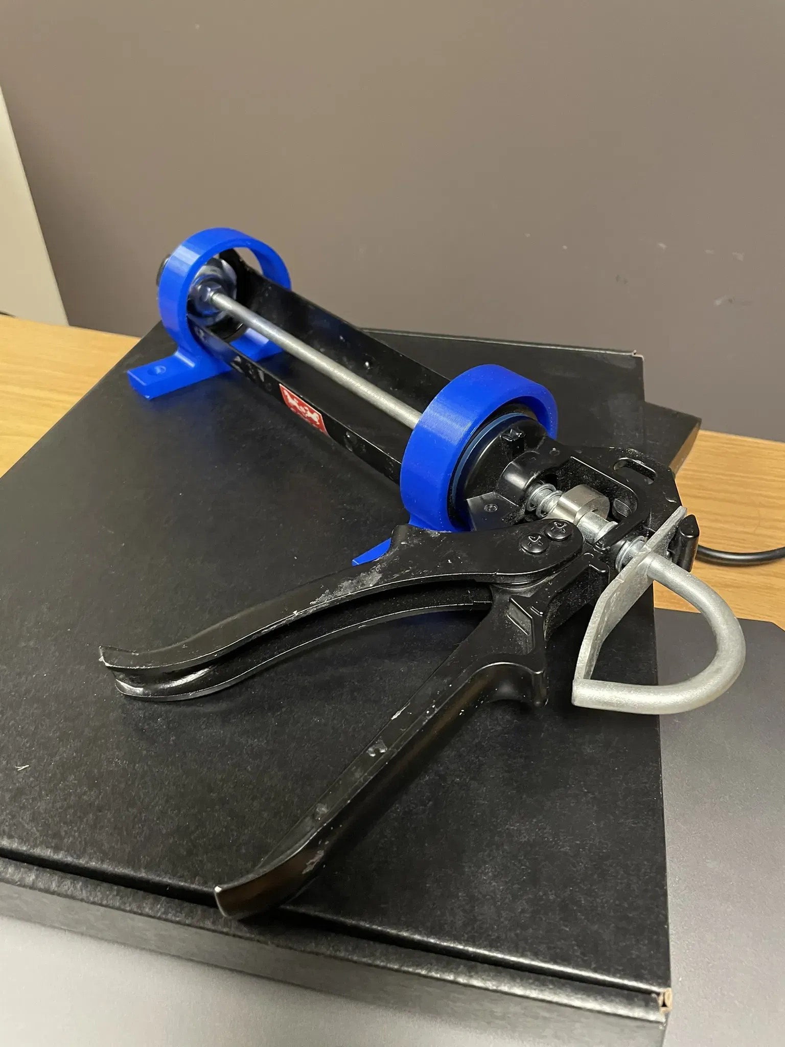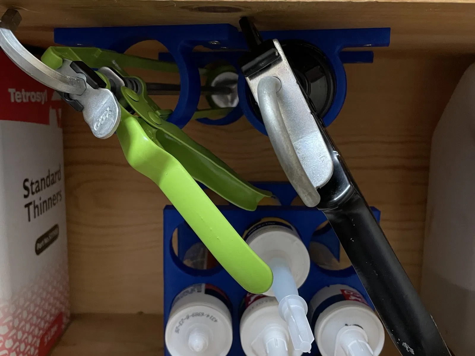 Tui cần một cái giá đỡ để gắn súng bơm keo ở mặt dưới của kệ, trong tủ đồ sơn của tui. Tui có chỉnh sửa lại thiết kế từ SSL, và thay đổi lỗ vít để dùng được với vít gỗ chìm 4mm.