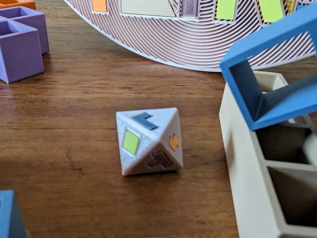 - 10/30/2023: @KyleGoeken_809075 đề xuất một viên xúc xắc với 8 mặt (D8) cho mỗi hướng của mảnh có thể, có một mặt cụ thể cho S/Z và cũng J/L. Tổng cộng có 7 mặt, mặt thứ 8 là trống và có thể được sử dụng như “bỏ qua/qua lượt” hoặc “sử dụng bất kỳ mảnh nào bạn muốn”, thậm chí có thể là “loại bỏ một mảnh khỏi cái cân”. Hãy sử dụng trí tưởng tượng của bạn và thử những khả năng mới. Đặt mặt trống phẳng trên giường in để có kết quả tốt hơn.