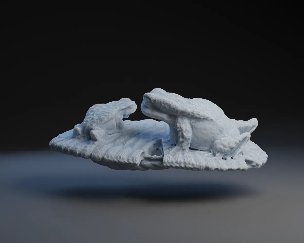 Chiêm ngưỡng mô hình 3D độc đáo 'Hai con Cóc trên Củ Súng Nổi'. Một tác phẩm netsuke tinh xảo, tái hiện sinh động hình ảnh hai chú cóc đang nghỉ ngơi trên một đóa củ súng, mang đậm nét nghệ thuật điêu khắc truyền thống. Thích hợp cho bộ sưu tập hoặc trang trí không gian của bạn.