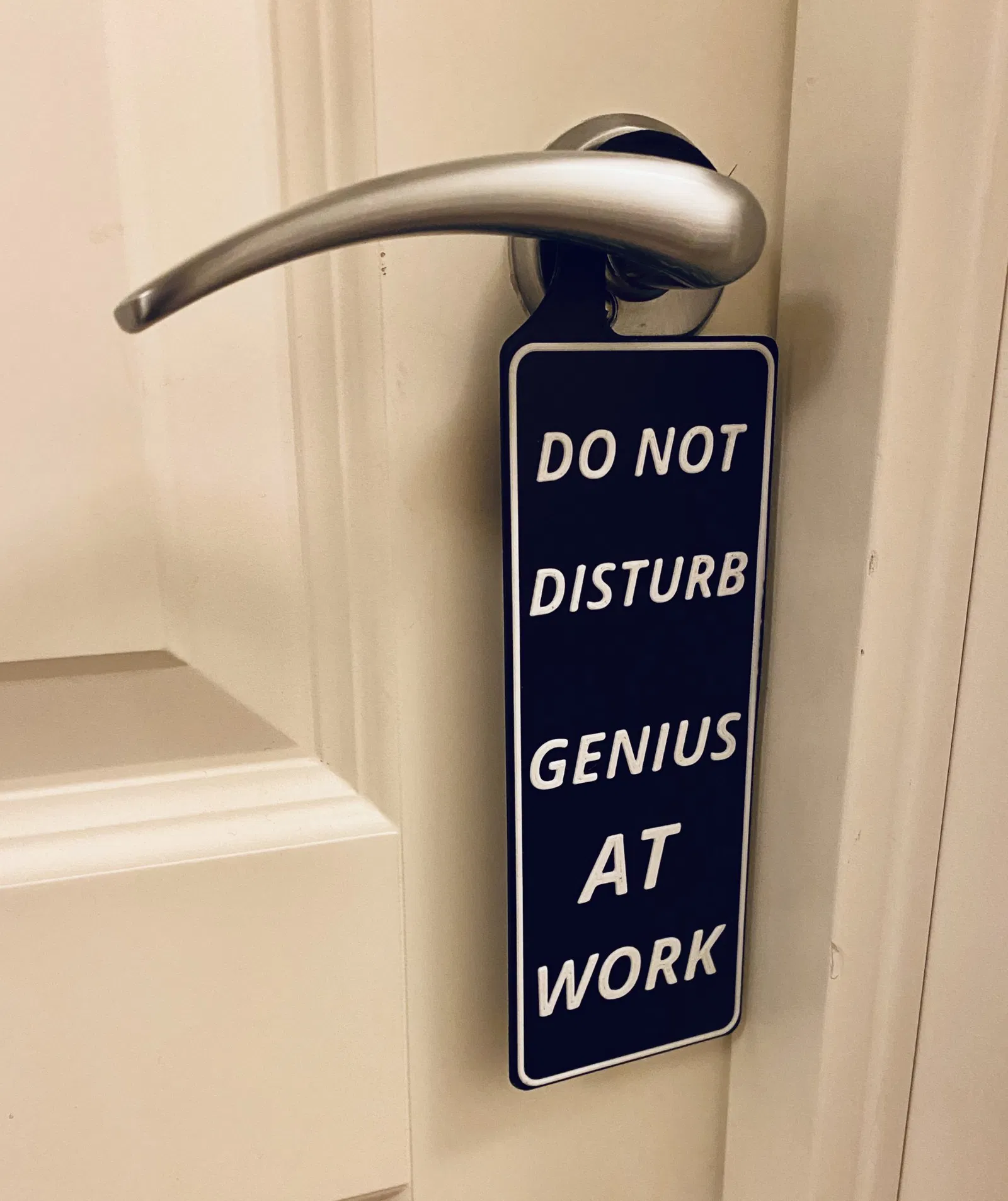 Cái bảng nhỏ xíu này để treo lên tay nắm cửa, có dòng chữ "Không làm phiền, Thiên tài đang làm việc". In mau, không cần support, có thể đổi màu chữ và khung tùy thích. Thích hợp cho anh em muốn có không gian yên tĩnh để sáng tạo.