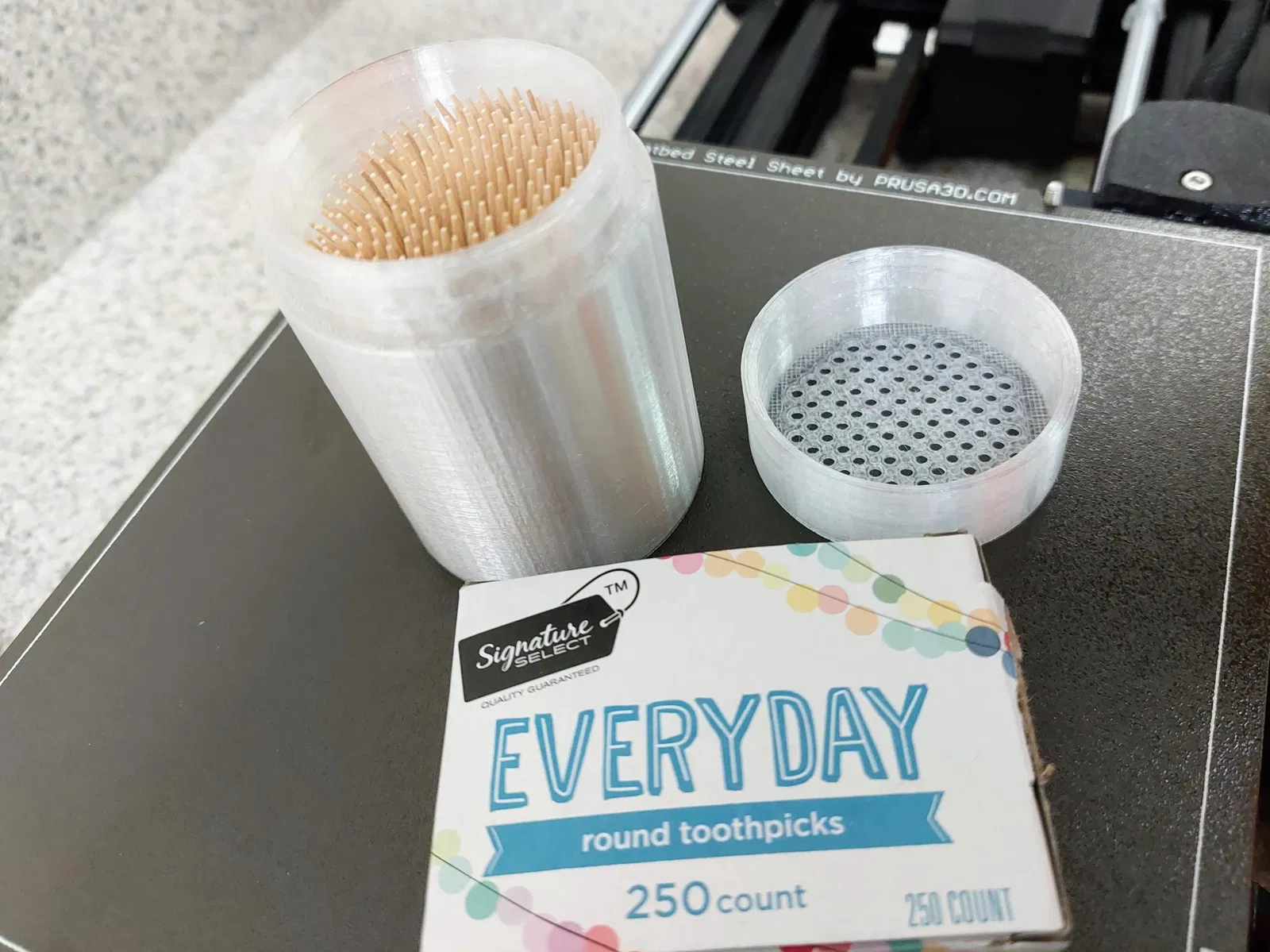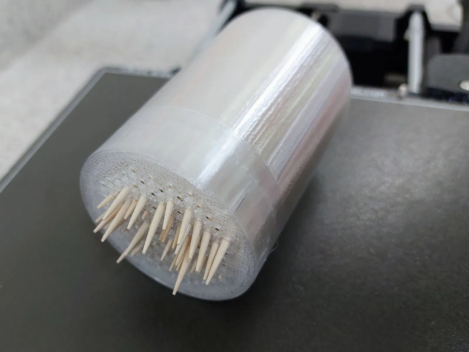 Mẹo in (tùy chọn): Tôi đã in lớp đầu tiên dày (0.4 với vòi phun 0.6, hoặc sử dụng 0.3 với vòi phun 0.4) để đảm bảo tôi có độ bám dính tốt xung quanh và tiết kiệm thời gian in. Đây là cơ hội của bạn để khoe khoang hoặc điều chỉnh lớp đầu tiên của bạn. Nắp được in với 100% độ đặc. Xi lanh với độ đặc bằng không cũng để tiết kiệm thời gian in.