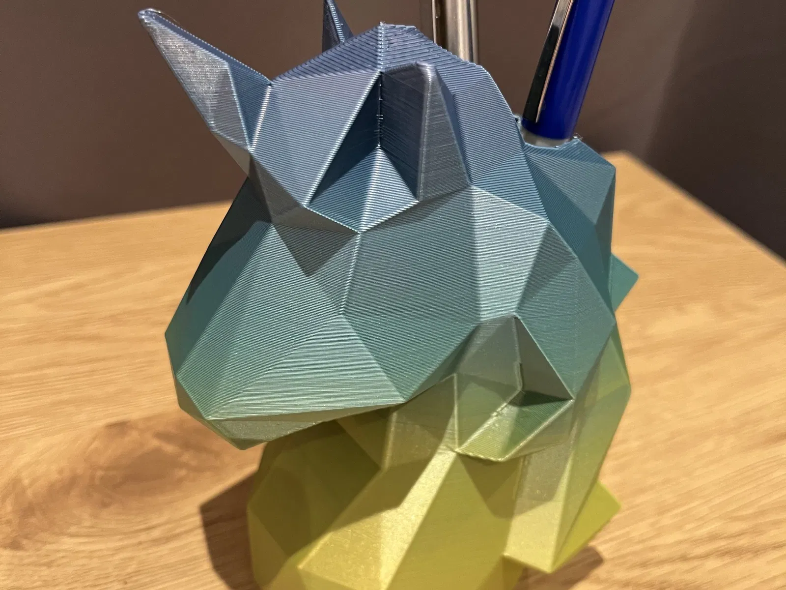 Giá đỡ bút kỳ lân - bản phối lại từ một mẫu khác, có thêm lỗ để cắm bút, bút dạ, v.v. Cần support ở phía trước, in ở kích thước 150% so với bản gốc trên máy Prusa mini, dùng sợi Rosa Filaments rainbow PLA.