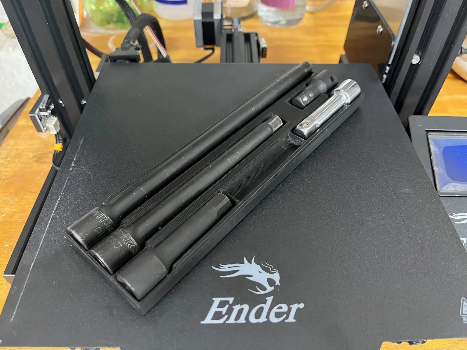 Trong công cuộc sắp xếp hộp dụng cụ của tui, tới lượt mấy cái cần tuýp nối dài rồi nè. Tui đã thiết kế cái khay này để đựng bộ cần tuýp va đập 3/8 drive của Harbor Freight 67926, rồi tui thêm một ô và một khay dự phòng cho chắc ăn. Giờ thì nó có thể đựng được 5 món, từ mấy cái dài 1.75" tới 8.25". Tui đã in nguyên khối, nhưng cũng có kèm bản rỗng để tiết kiệm nhựa PLA. Bản rỗng thì nên in úp xuống nha. Tui in với độ dày lớp tới 0.24mm luôn đó, tại cái này chỉ để xài thôi chứ không phải để trưng bày. Có hơi phải giảm tốc độ in xuống để đẩy ra được nhiều nhựa vậy đó.