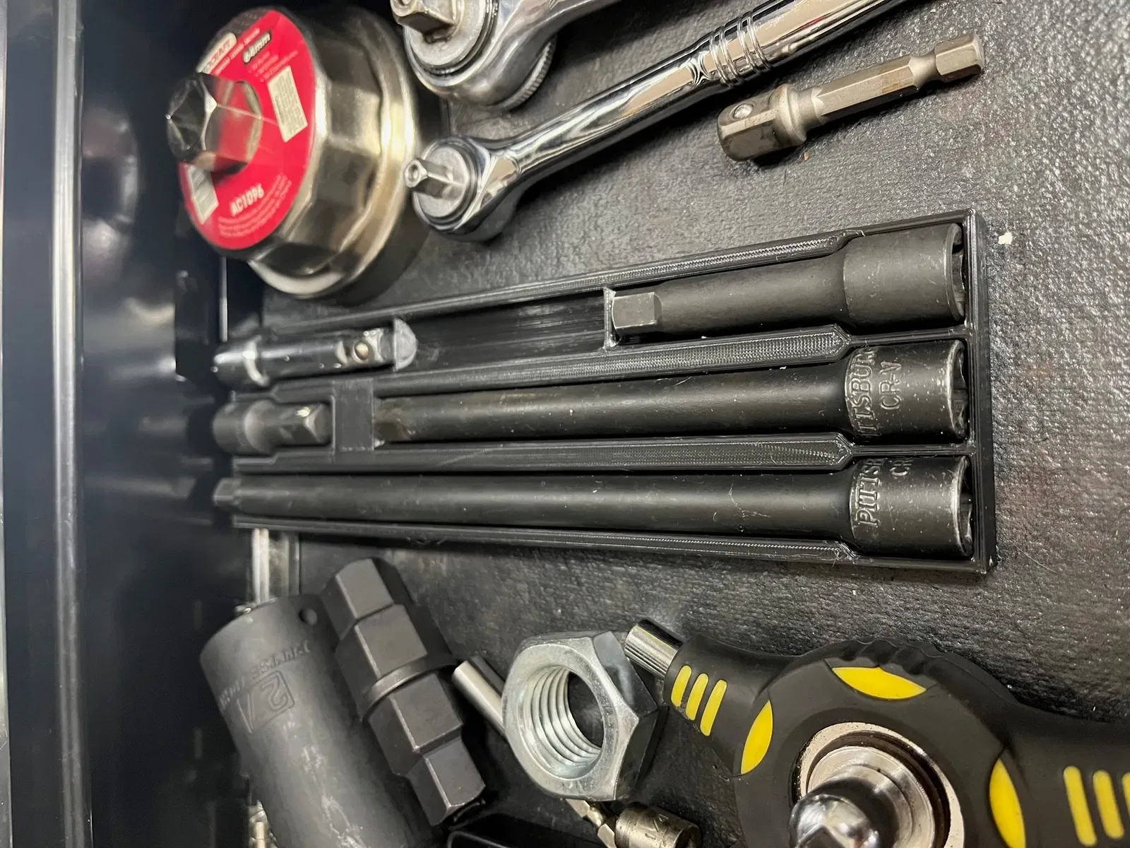 Tui thiết kế cái khay này để đựng bộ 5 cái cần tuýp nối dài 3/8 Drive của Harbor Freight 67926, từ 1.75" tới 8.25". Có bản in nguyên khối và bản in rỗng để tiết kiệm nhựa. Thích hợp để sắp xếp gọn gàng hộp dụng cụ.