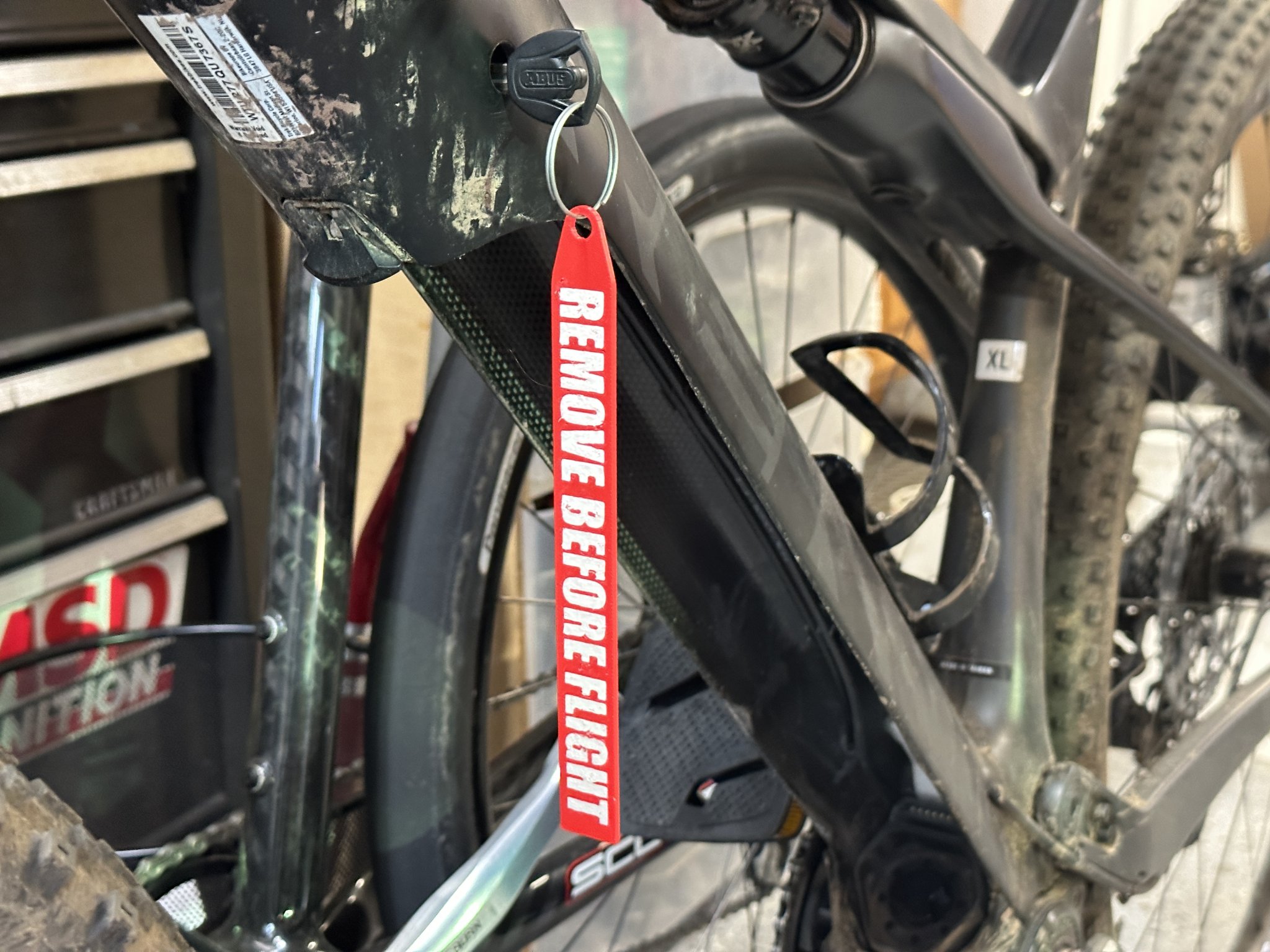 Yet another “REMOVE BEFORE FLIGHT” tag. I used mine to remind me where I left the key to my eMTB.