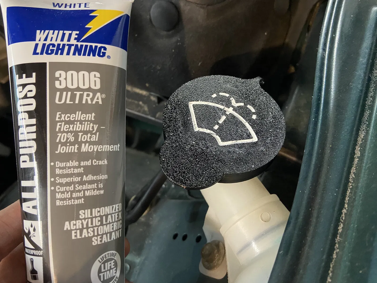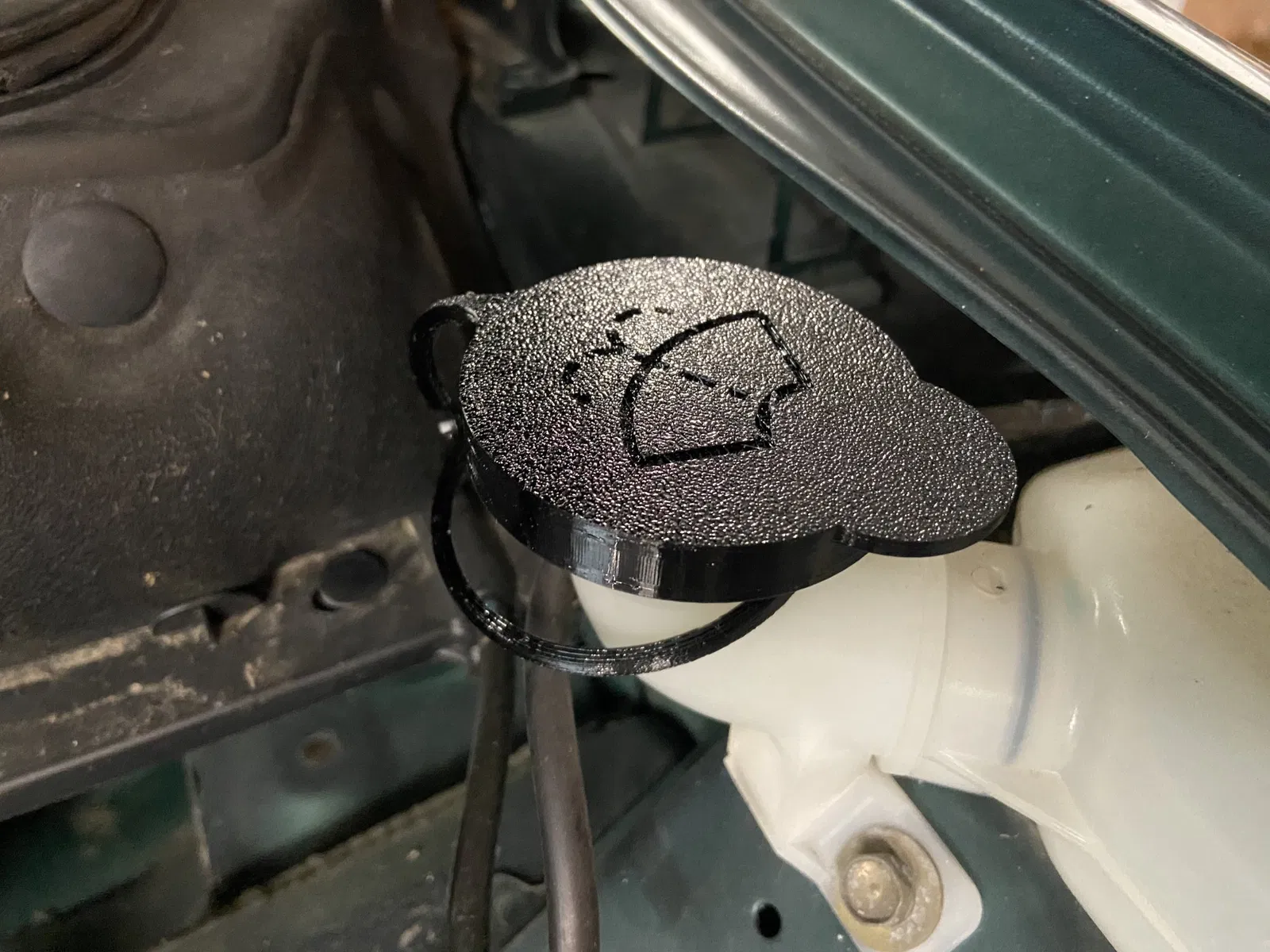 Bản chỉnh sửa lại từ thiết kế của Thelguana, dự định in bằng TPU (hoặc sợi nhựa dẻo khác). Tôi đã thêm một dây giữ có khoen để luồn vào cổ của lỗ chứa nước rửa kính. Tôi cũng thêm một logo để chỉ ra nắp này dùng để làm gì.