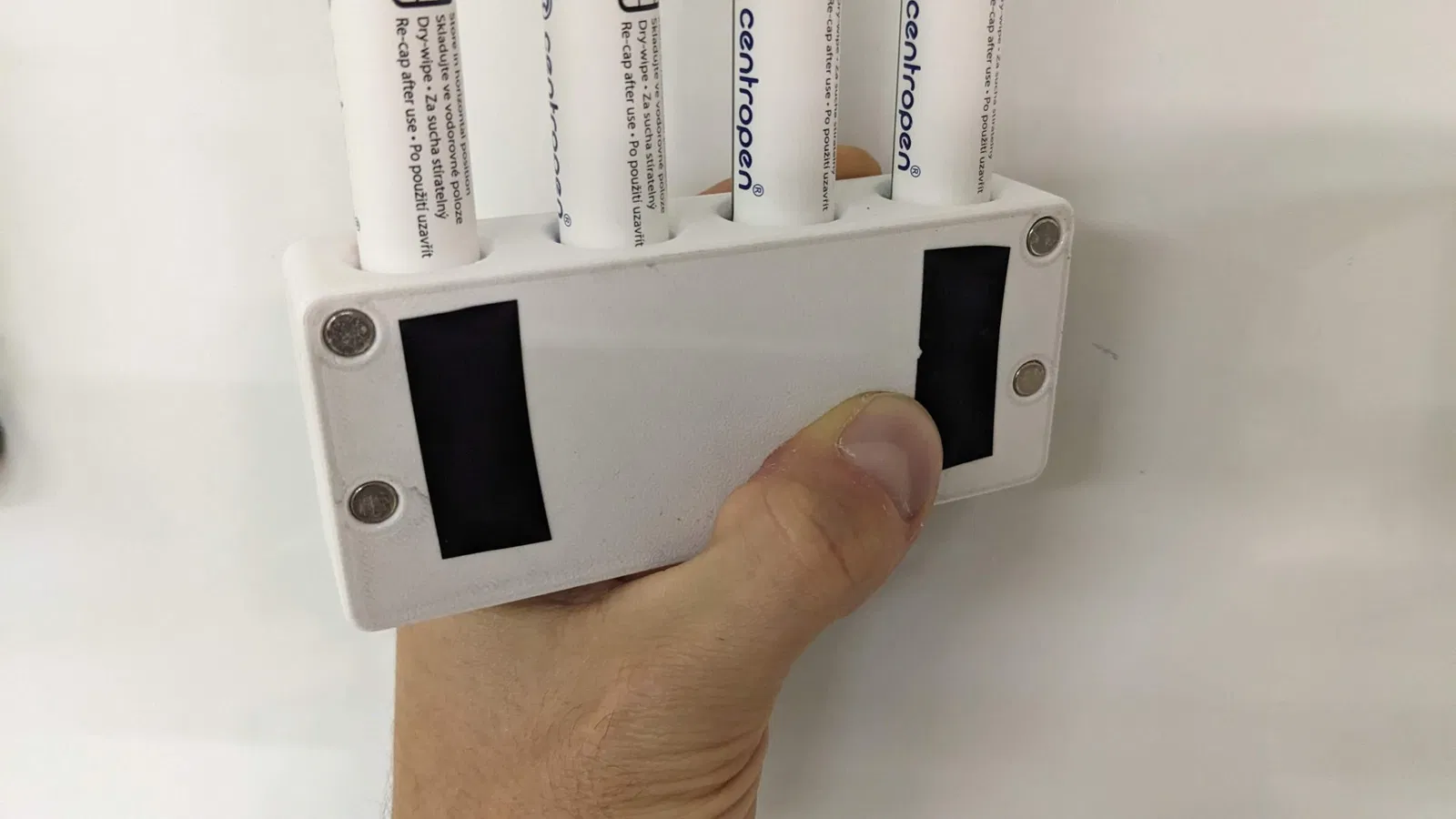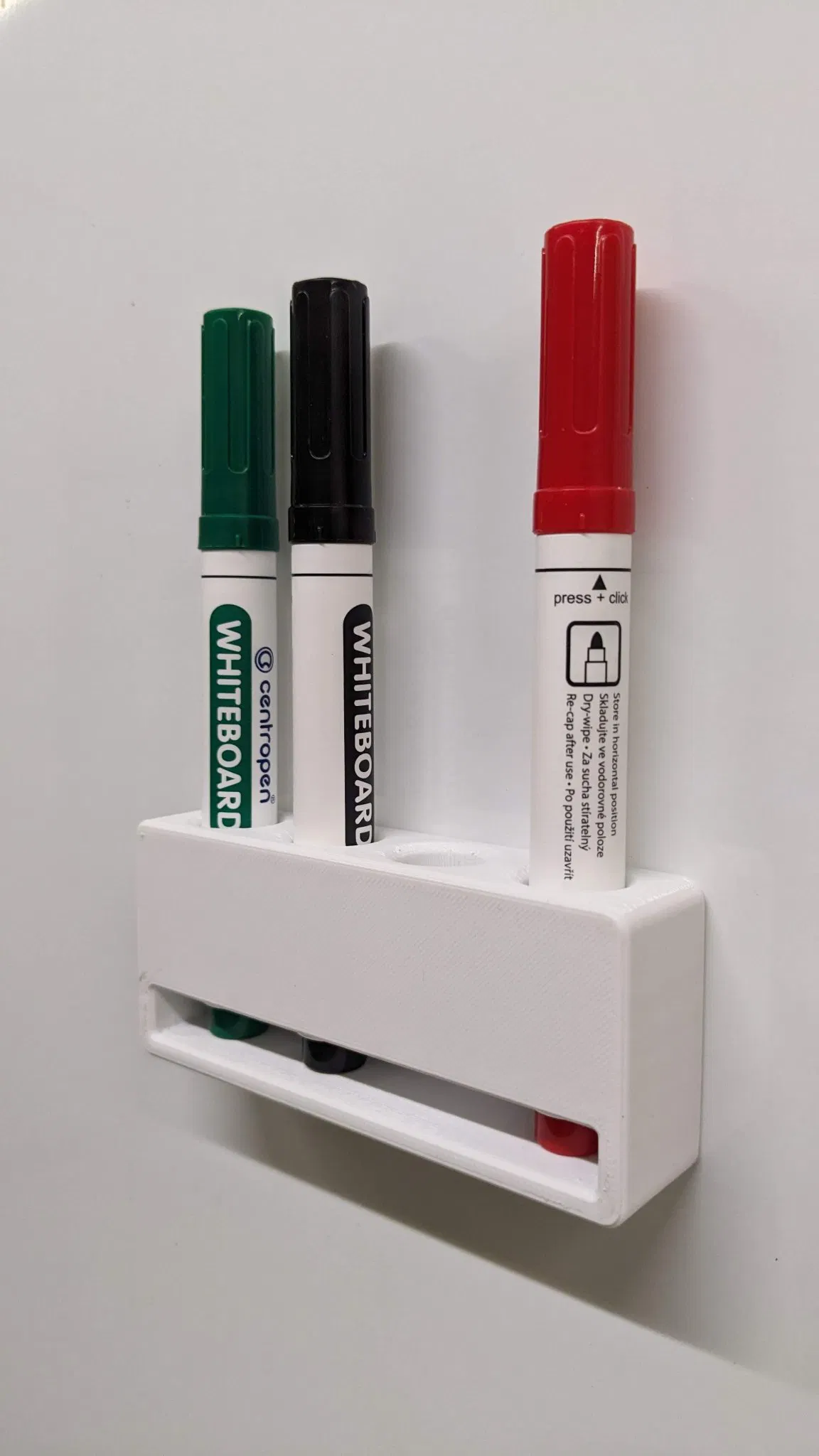 Một cái khay đơn giản để đựng 4 cây bút bảng, có nam châm dán được lên bảng. Dễ in và dễ sử dụng, giúp không gian làm việc gọn gàng hơn.