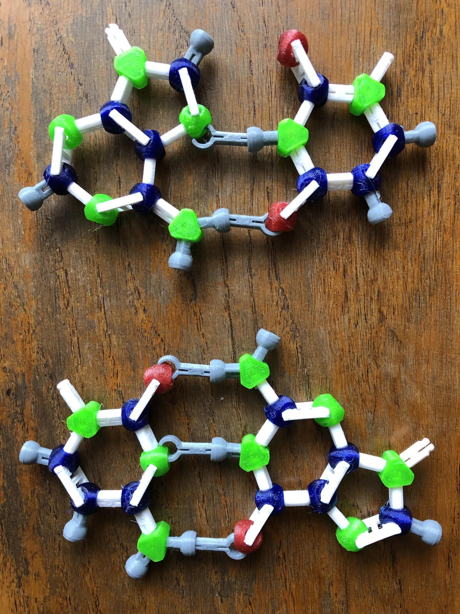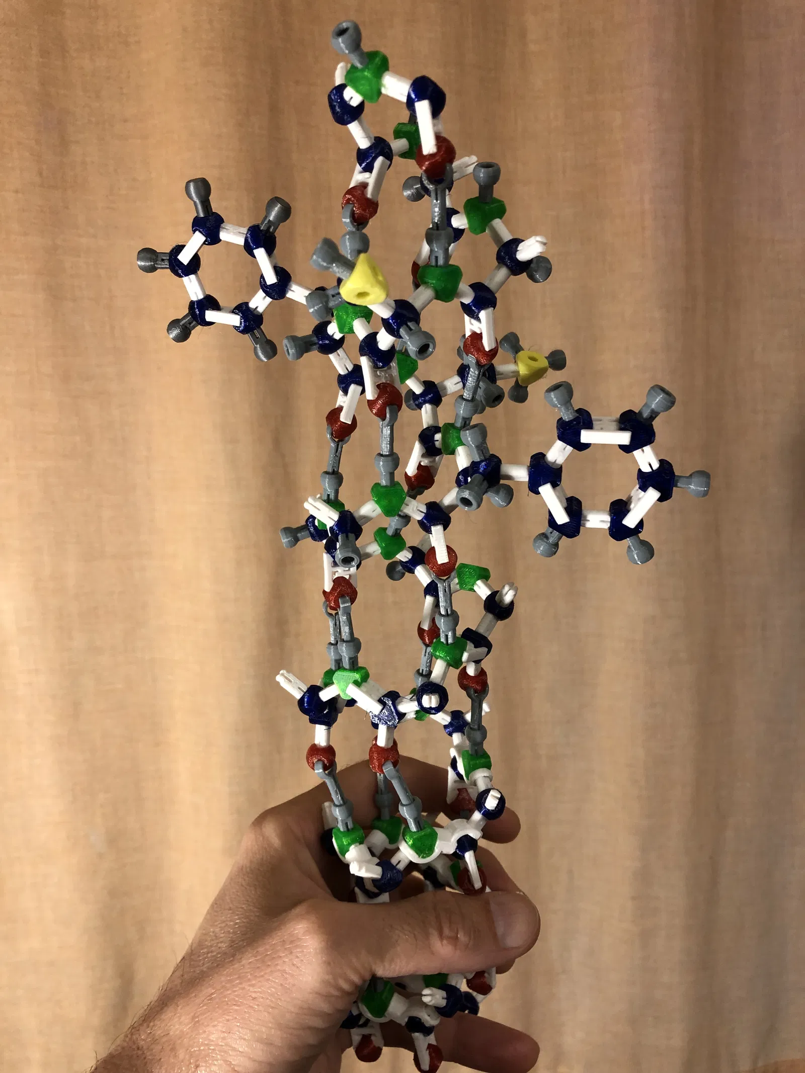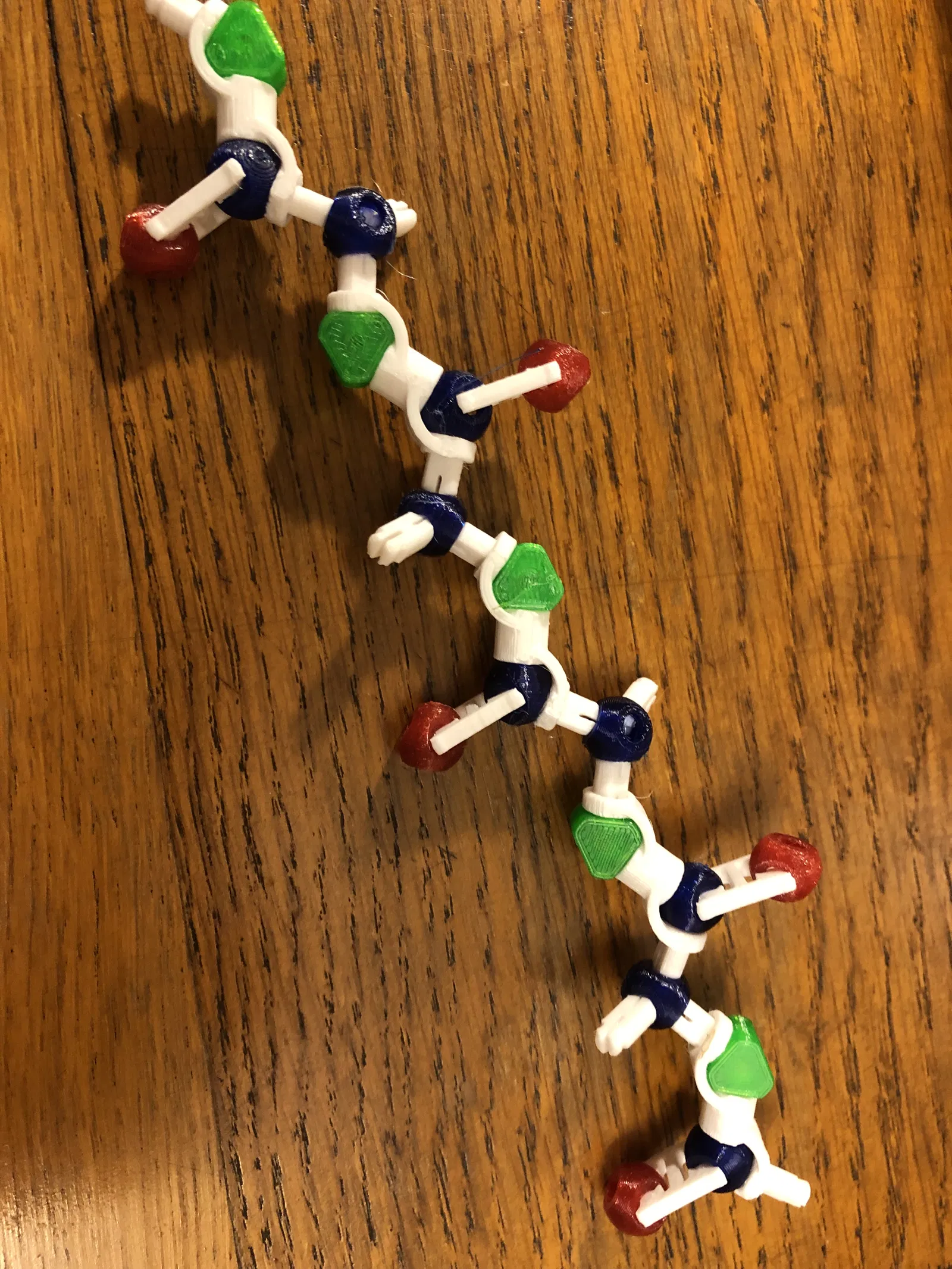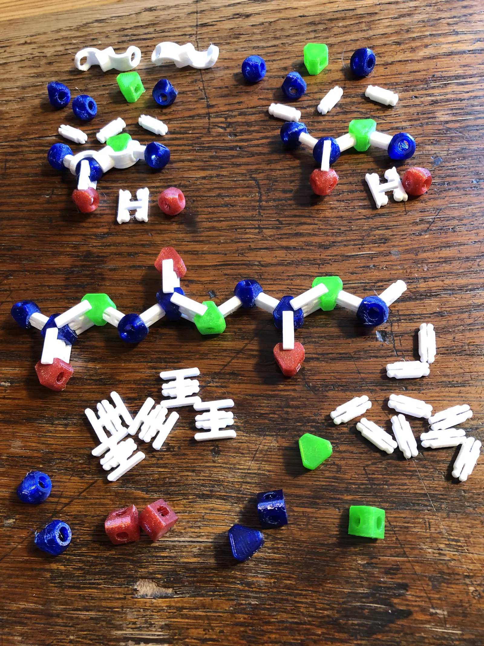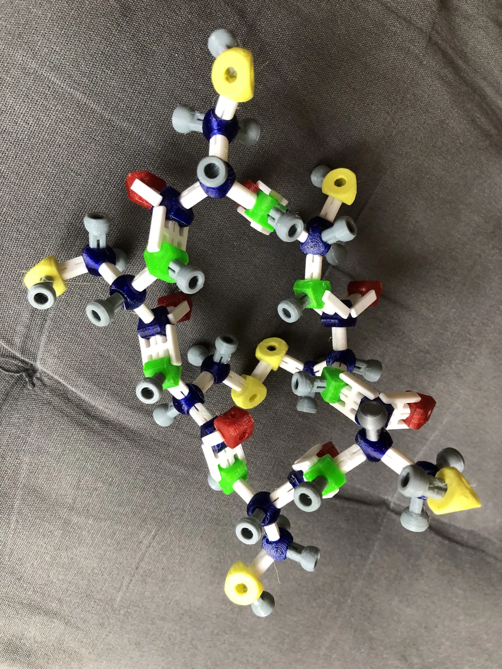 Ngoài ra, bạn có thể xây dựng chuỗi peptide bằng cách sử dụng bộ phận bond1double1.stl cho liên kết đơn không xoay đó, sử dụng hình dạng Nitrogen-tri.stl cho carbon và liên kết oxy với nó bằng bond-double-P.stl. Bạn cũng có thể xây dựng các lõi thơm đẹp hơn bằng cách sử dụng ba bộ phận bond1double1.stl, ba liên kết đơn và sáu nguyên tử carbon có hình dạng Nitrogen-tri.stl.