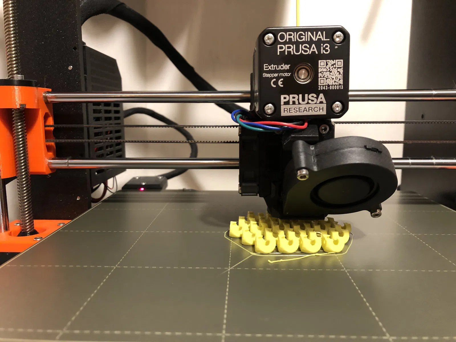 Các bộ phận khớp nối (liên kết) cần PETG, đừng dùng PLA cho chúng, nó sẽ sớm bị gãy. (Có lẽ PLA sẽ ổn cho các nguyên tử.) Khi in nhiều bộ phận PETG nhỏ, brim là một phiền phức (khó gỡ ra khỏi bộ phận) nên tôi in không dùng brim. Các nguyên tử hình hạt dễ lấy ra khỏi bàn in sau khi in nên hãy tối đa hóa độ bám dính để đảm bảo mỗi hạt bám chắc và ở đúng vị trí trong quá trình in: