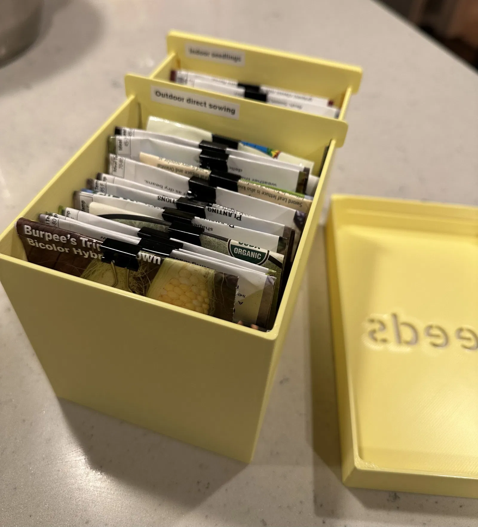 Cái hộp nhỏ này giúp bạn đựng và sắp xếp các gói hạt giống làm vườn, lấy cảm hứng từ tủ hồ sơ. Bạn có thể dùng "tab" để phân loại hạt giống. Hộp được làm chắc chắn với độ dày 2mm, nắp đóng khít. Phiên bản cập nhật có phần cắt chữ dày hơn và file STL riêng cho từng bộ phận. In bằng PLA, không cần hỗ trợ.