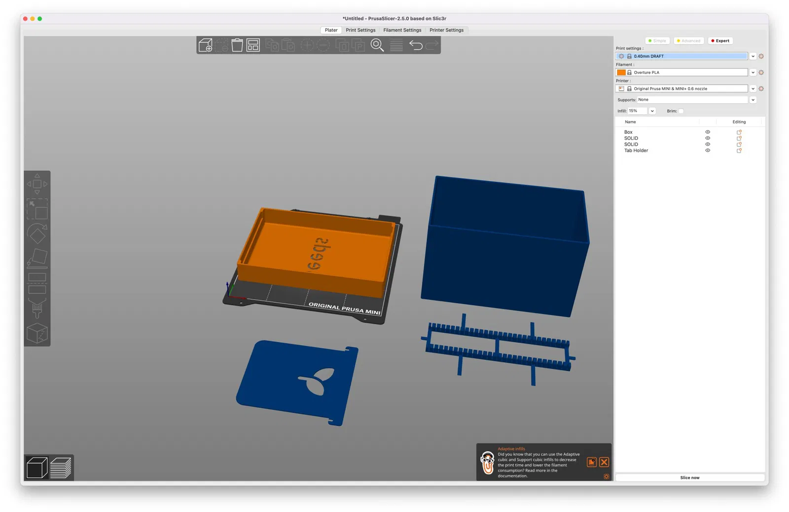 Với kích thước của hộp, việc in nhanh hơn nếu dùng đầu phun lớn hơn (ở đây là 0.6mm).