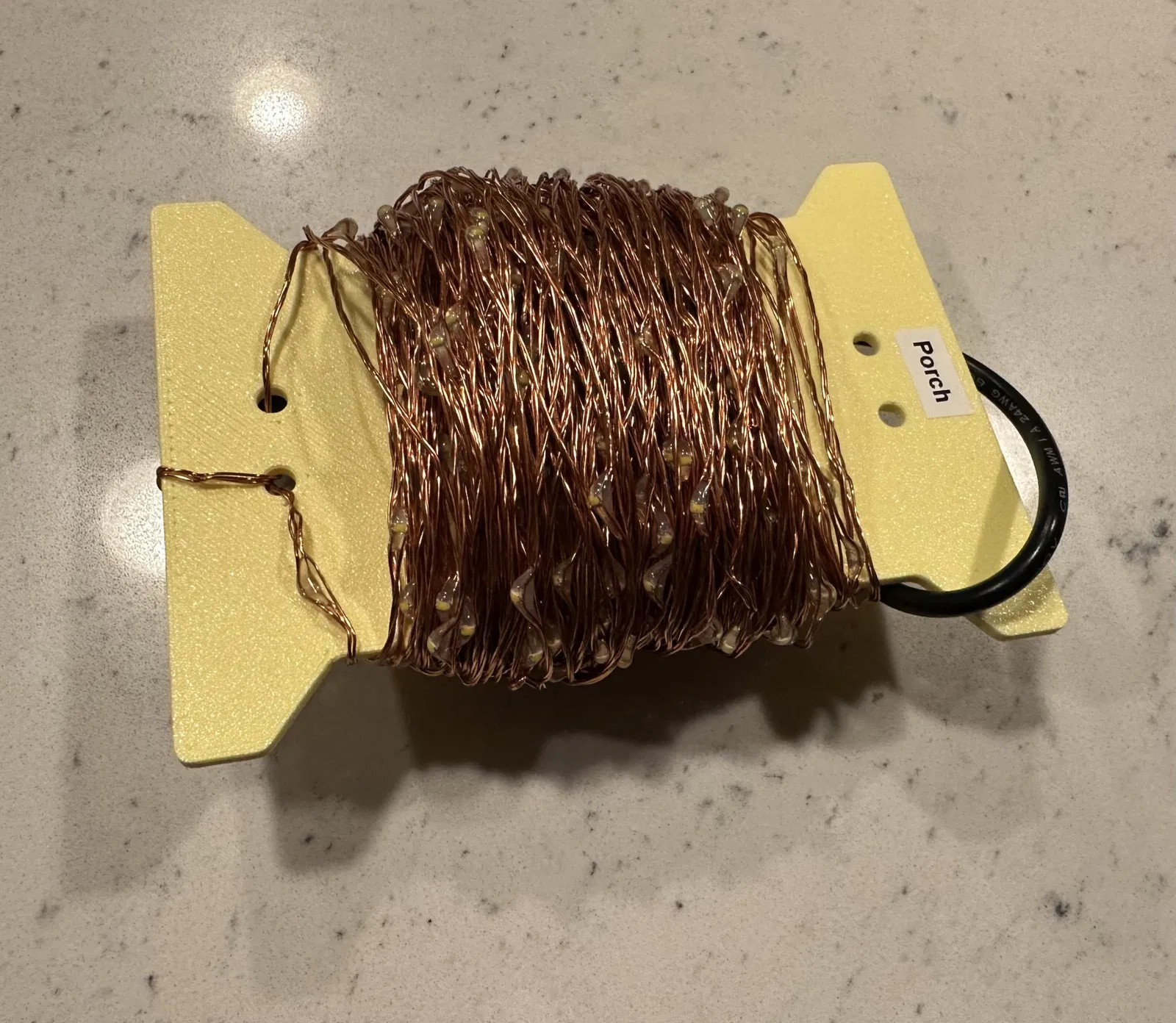 Chán xài giấy carton quấn dây đèn Giáng sinh bị rách, em làm cái "Flat Reel" bằng nhựa này xài bền hơn. Có chỗ dán nhãn, lỗ chống tuột dây. In với PLA, không support.