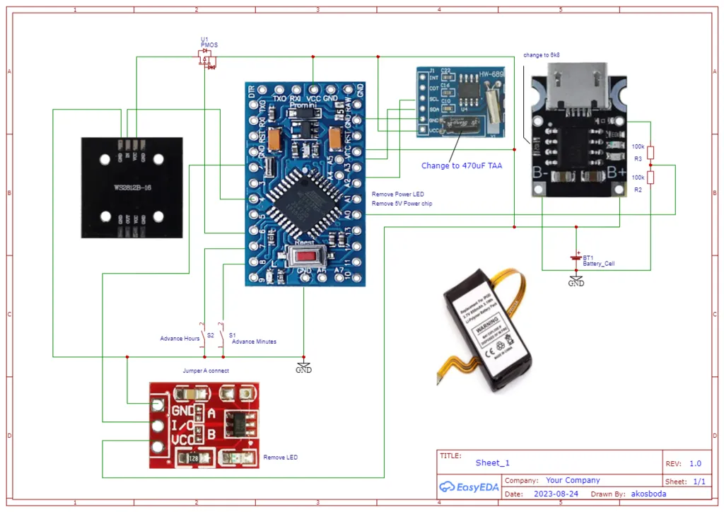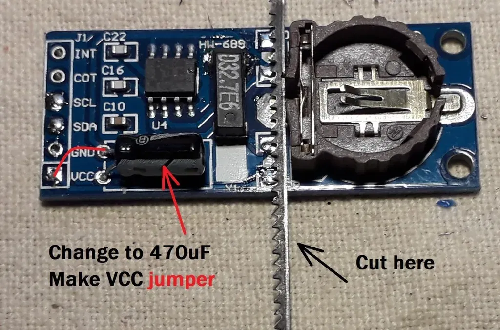 PCF8563 clock module : Cut the module in half as shown, we don't need the battery since the LiIon will function as backup battery. Cutting the PCB breaks the VCC path, restore it with a jumper.