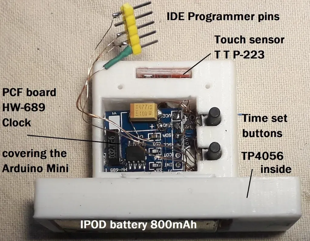 Touching the top, the Arduino gets a wake up interrupt from a TTP223 touch sensor, wakes from sleep, reads the time keeping chip PCF8563 and displays the time on WS2812 chain. Waits 2 sec, turns off the WS2812 supply and goes back to sleep mode to save the battery. In this mode, the consumption is about 30 uA, it means that the battery is good for 20000 working hours (many years theoretically) with a single charge.