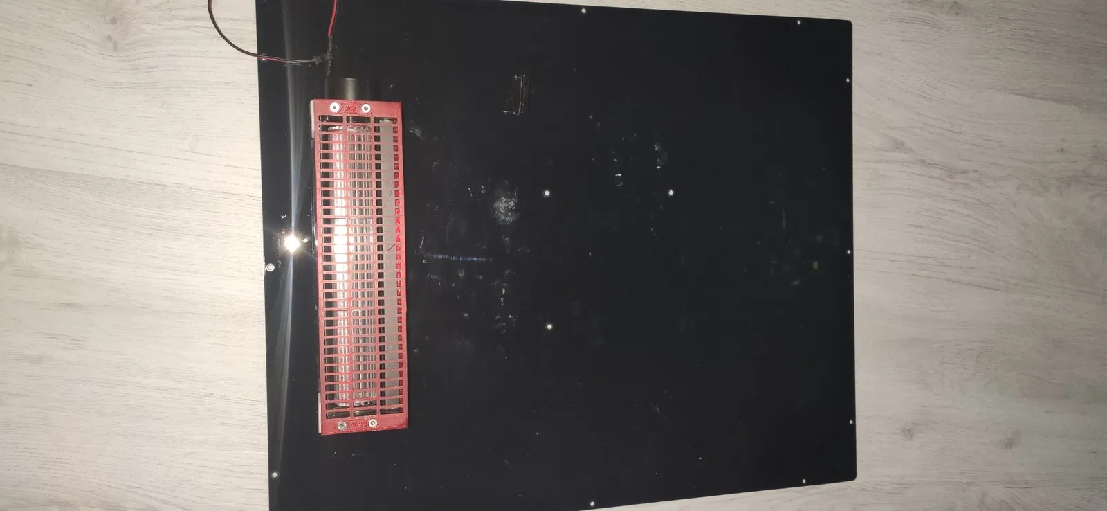Hạ bàn in xuống vị trí thấp nhất, sau đó đặt quạt áp sát vào thành hông bên phải, chú ý để lại một khoảng trống nhỏ với giá đỡ bàn in (3 đến 4 mm), rồi đánh dấu và khoan lỗ cố định trên tấm hông.