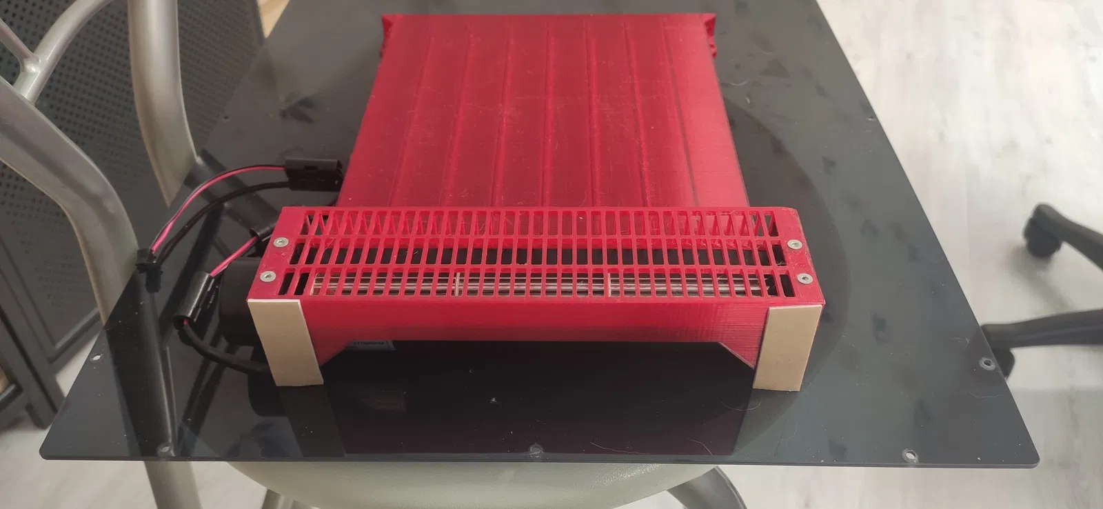 Để đặt quạt, tôi đã dán băng dính hai mặt dưới quạt, để nguyên lớp màng của băng dính, làm như vậy giống như một bộ giảm rung.