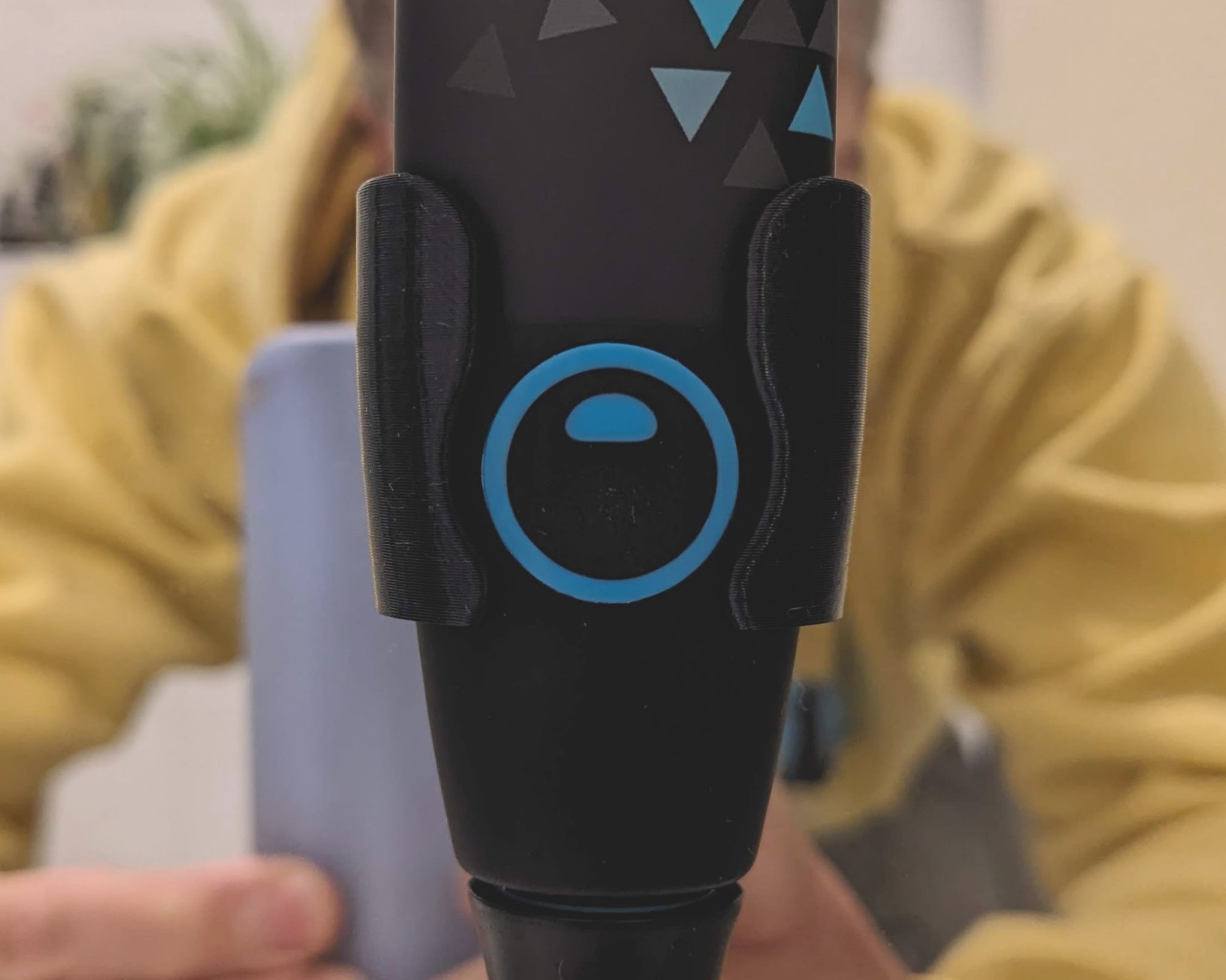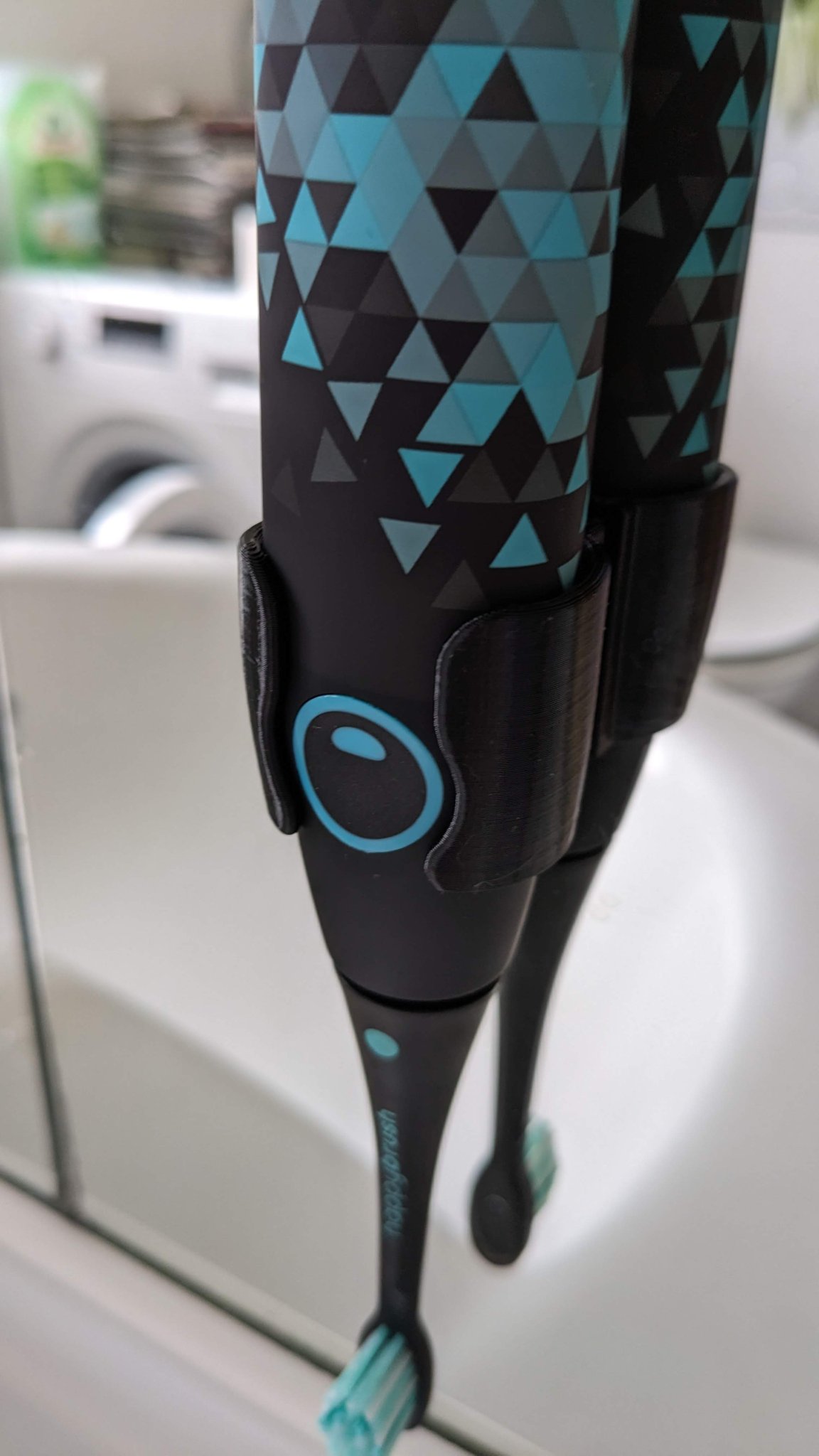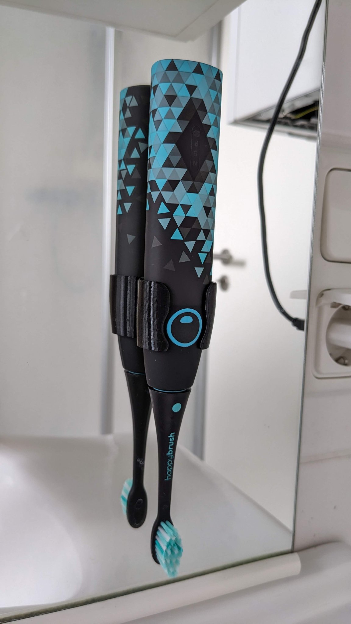 Một cái giá treo trên cao cho bàn chải đánh răng Happybrush Eco VIBE 3. Cái giá này giúp ngăn nước đọng xuống tay cầm và giữ bàn chải không bị đọng nước trên bồn rửa.