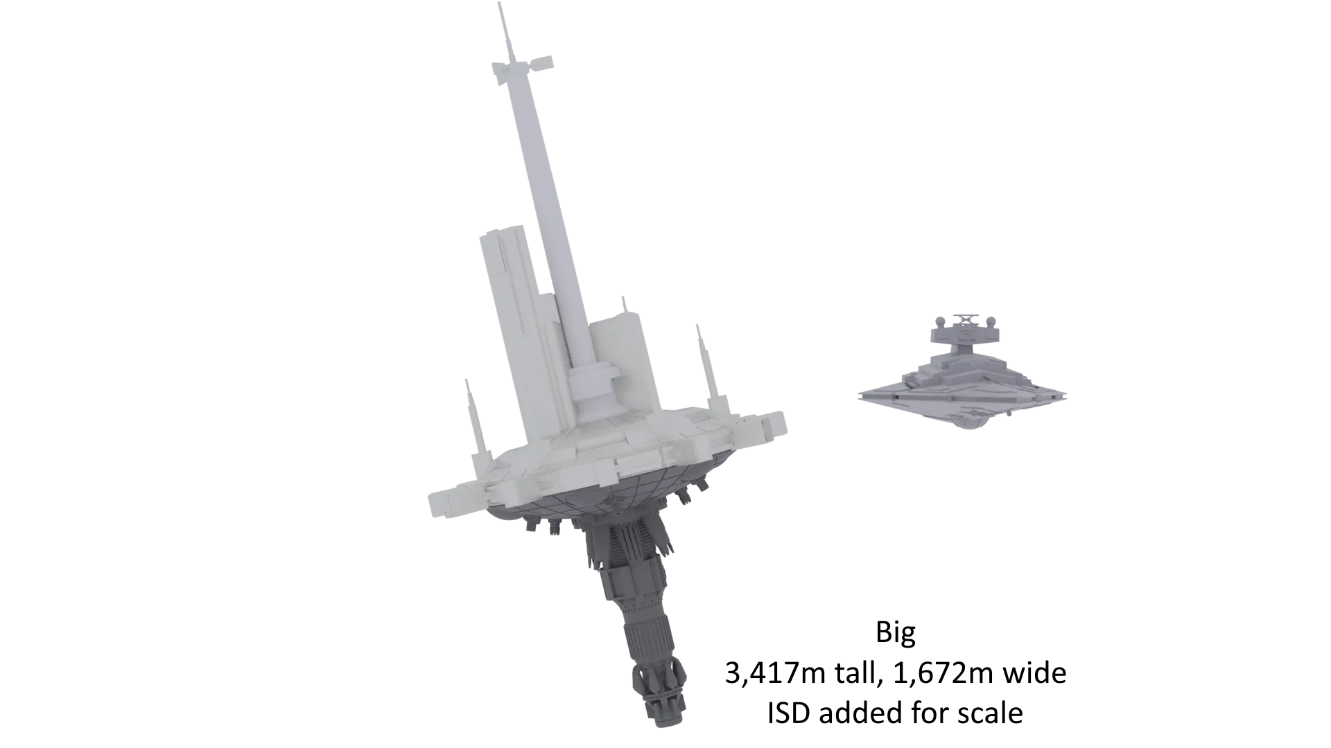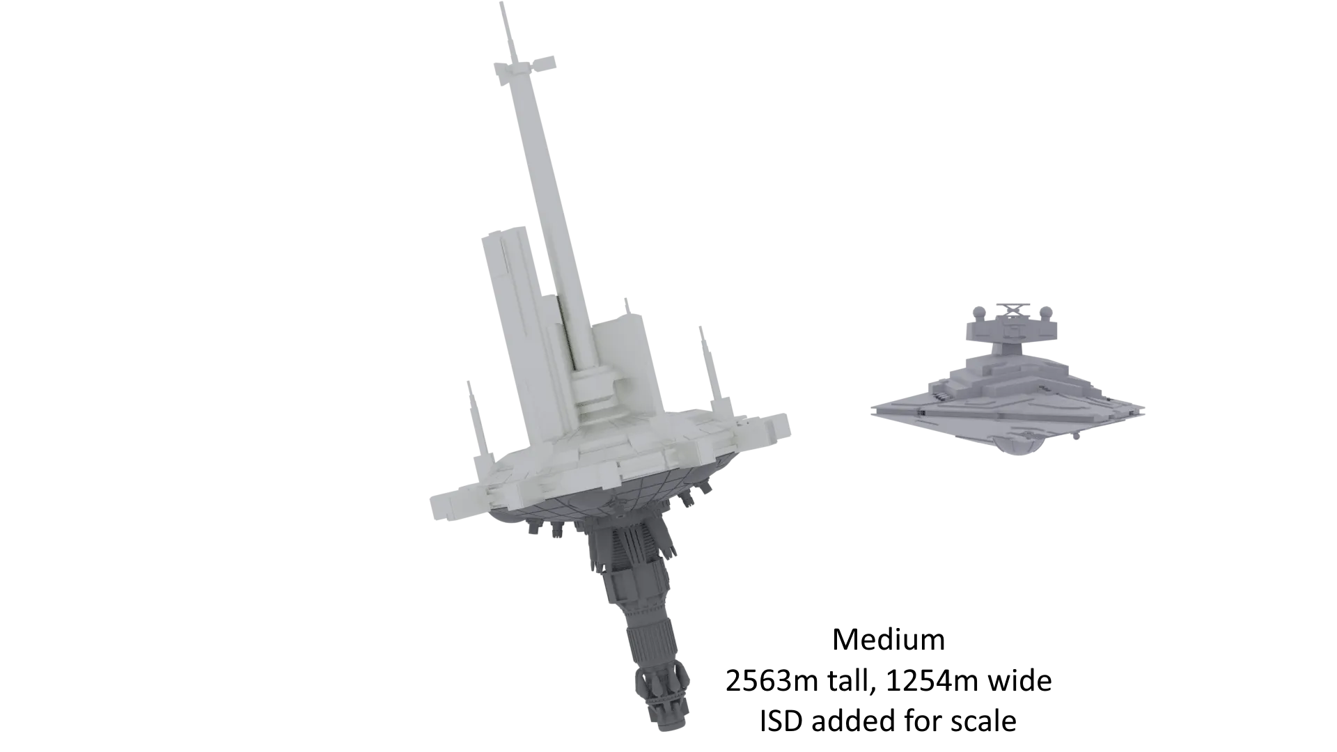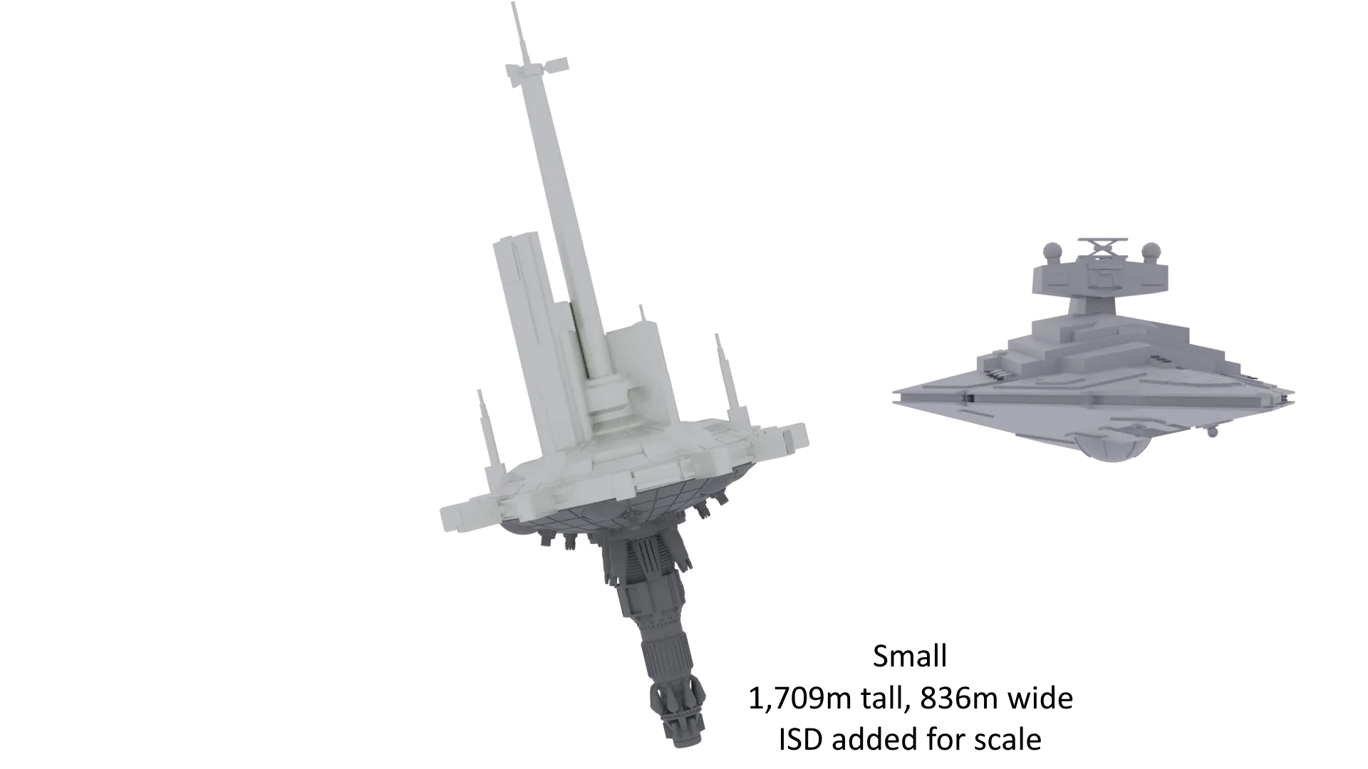 Mình nhắm tới tỷ lệ 1:10.000. Vấn đề duy nhất là mình không tìm thấy bất kỳ thông tin nào về kích thước canon của nó, ngoài việc "nó có kích thước tương đương với một tàu khu trục sao cỡ lớn" [The High Republic Show Tập 5]. Điều này có thể hiểu theo nhiều cách khác nhau, vì vậy mình đã tạo ra ba phiên bản với các tỷ lệ khác nhau.
