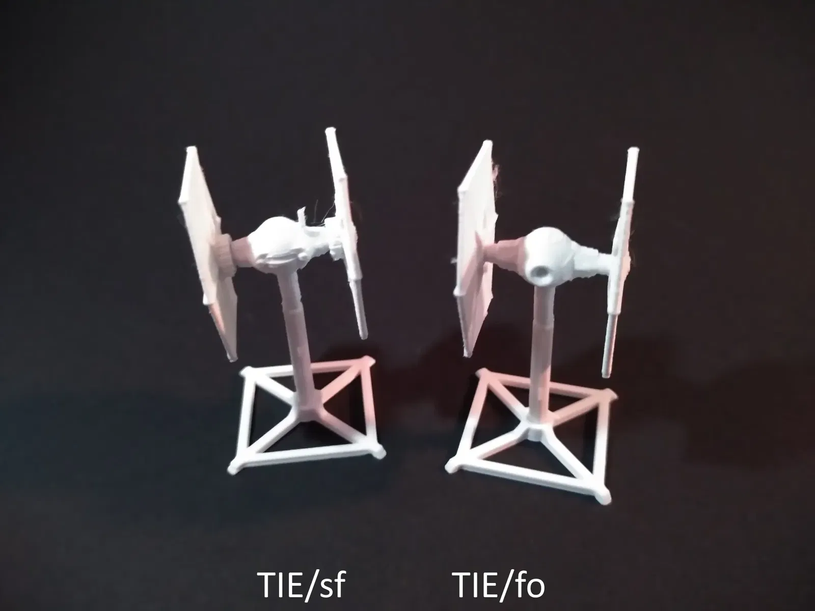 The TIE/fo and TIE/sf fighters are the First Orders primary starfighters. The TIE/fo is the standard TIE fighter, but unlike the imperial TIE/ln it is equipped with shields. The TIE/sf is a special forces variant, equipped with shields, a hyperdrive, a turret and space for a gunner. These models are at 1:270 scale. Each is 24.4mm long, 25.1mm wide and 31.0mm tall. For a holder, the version with peg is compatible with a . ### Print Instructions Printed at 0.15mm layer height. Requires supports on buildplate. Your silcer will probably add unecessary supports around the wings. You can block those out to save time and filament. If you want to support me, you can do so via this link: https://ko-fi.com/printingdaniel# [UPDATE 2023-04-04] Modified wings, new photos