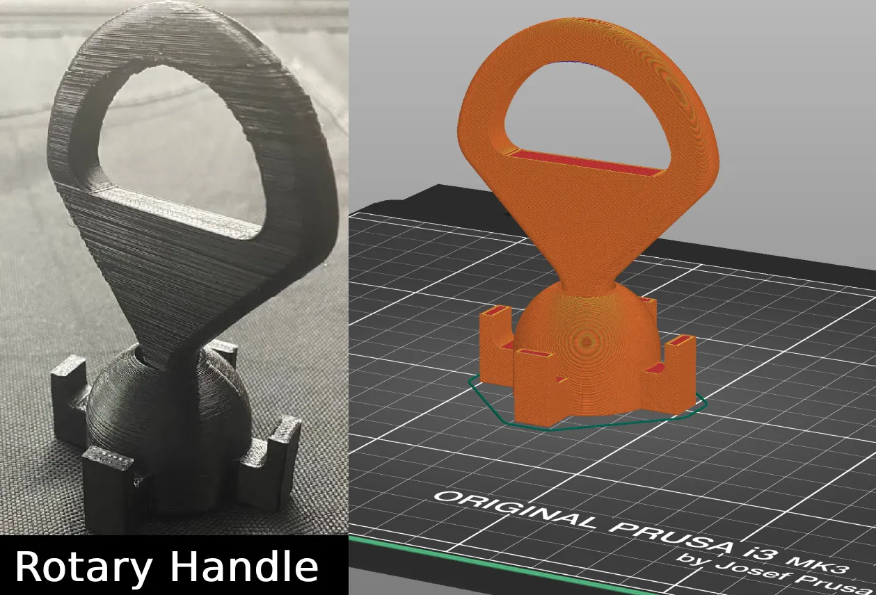 Tay cầm xoay giúp bạn mang vác đồ dễ dàng và đỡ vất vả hơn. Mẫu thử đã in ra ngon lành, tuy hơi khó in nhưng hoạt động tốt. Nhiệt độ khuyên dùng: 215°C (nozzle), 93°C (bed). Tốc độ: 60% tốc độ thường.